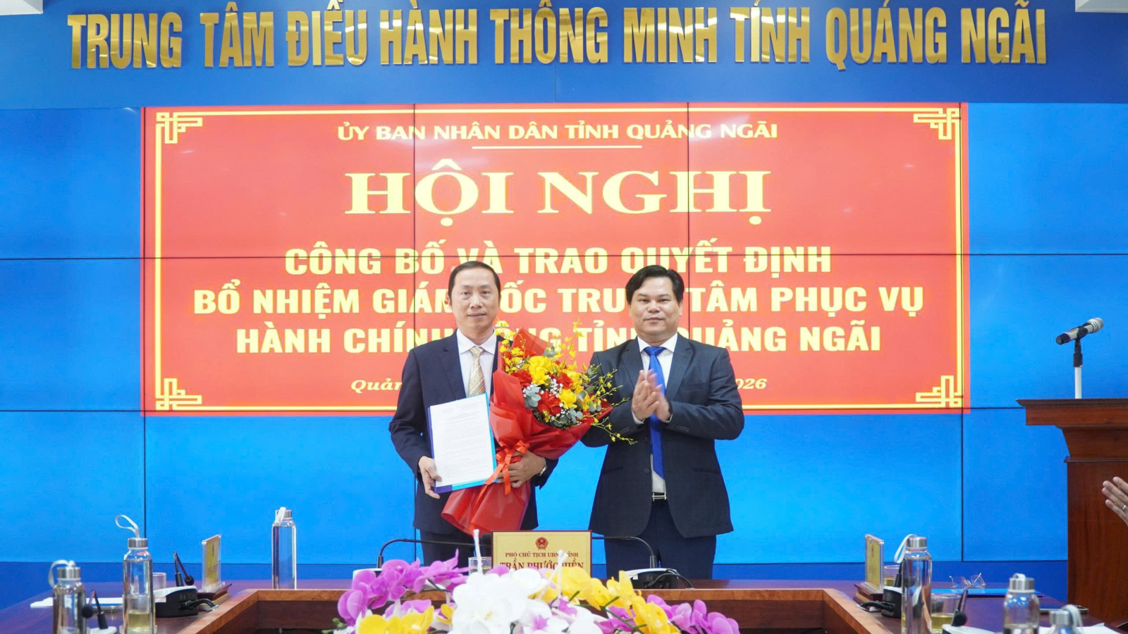 Sáng cùng ngày, Phó chủ tịch UBND tỉnh Quảng Ngãi Trần Phước Hiền đã chủ trì lễ công bố và trao Quyết định bổ nhiệm ông Nguyễn Thanh Hoài, Phó Giám đốc phụ trách Trung tâm Phục vụ hành chính công tỉnh Quảng Ngãi giữ chức Giám đốc Trung tâm Phục vụ hành chính công tỉnh Quảng Ngãi trong thời hạn 5 năm, kể từ ngày 12/01/2026 đến ngày 12/01/2031.