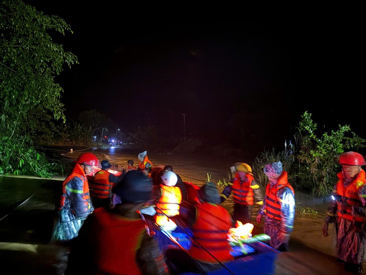 Đêm cùng ngày, lực lượng Cảnh sát PCCC và CNCH tiếp tục giải cứu từng gia đình, bảo đảm mọi người được đưa ra khỏi vùng nguy hiểm.