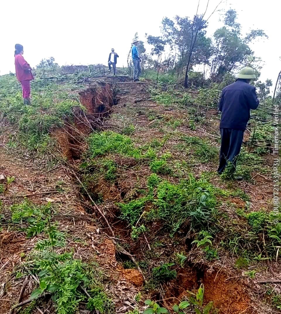 Từ chiều 15/11, tại khu vực đồi núi ở thôn Quyết Thắng, xã Sơn Kim 2, tỉnh Hà Tĩnh, xuất hiện vết nứt dài khoảng 150m. Ngọn đồi cao khoảng 50m, đã bị sụt lún 80cm, thậm chí có nơi bị sụt tới 1m, tạo nên rãnh sâu.