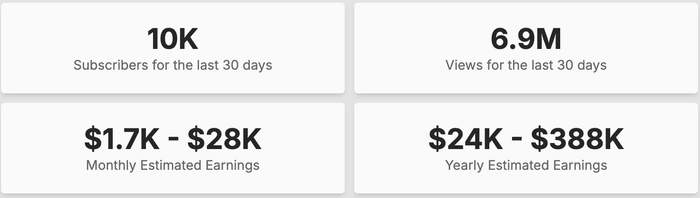 Theo số liệu thống kê từ Social Blade, trong vòng 12 tháng qua, kênh YouTube của ca sĩ Quang Lê mang về doanh thu ước tính từ 24.000 đến 388.000 USD - tương đương hơn 632 triệu đến hơn 10,2 tỷ đồng mỗi năm. Dù đây chỉ là con số ước lượng dựa trên lượng người xem và mức CPM trung bình, nhưng vẫn đủ để cho thấy sức hút mạnh mẽ của nam ca sĩ trong không gian mạng.