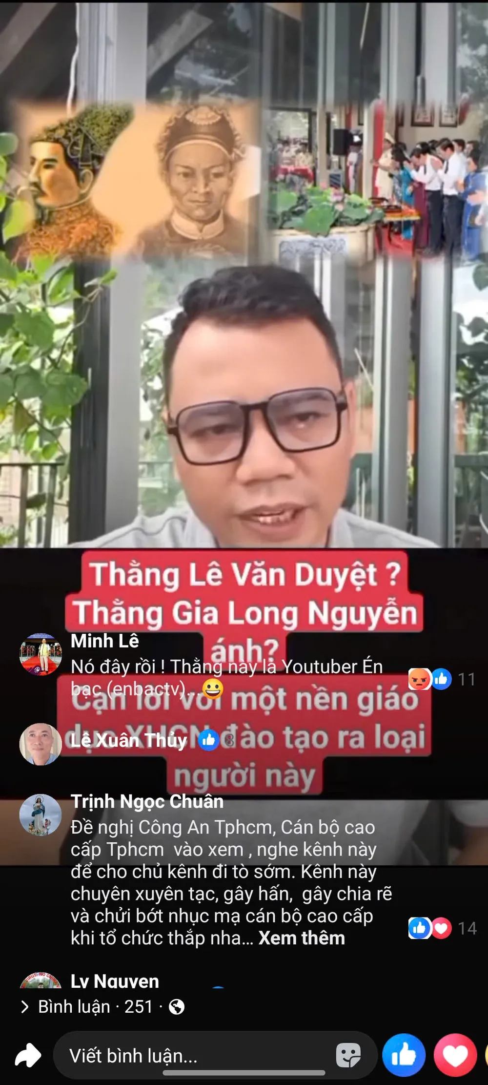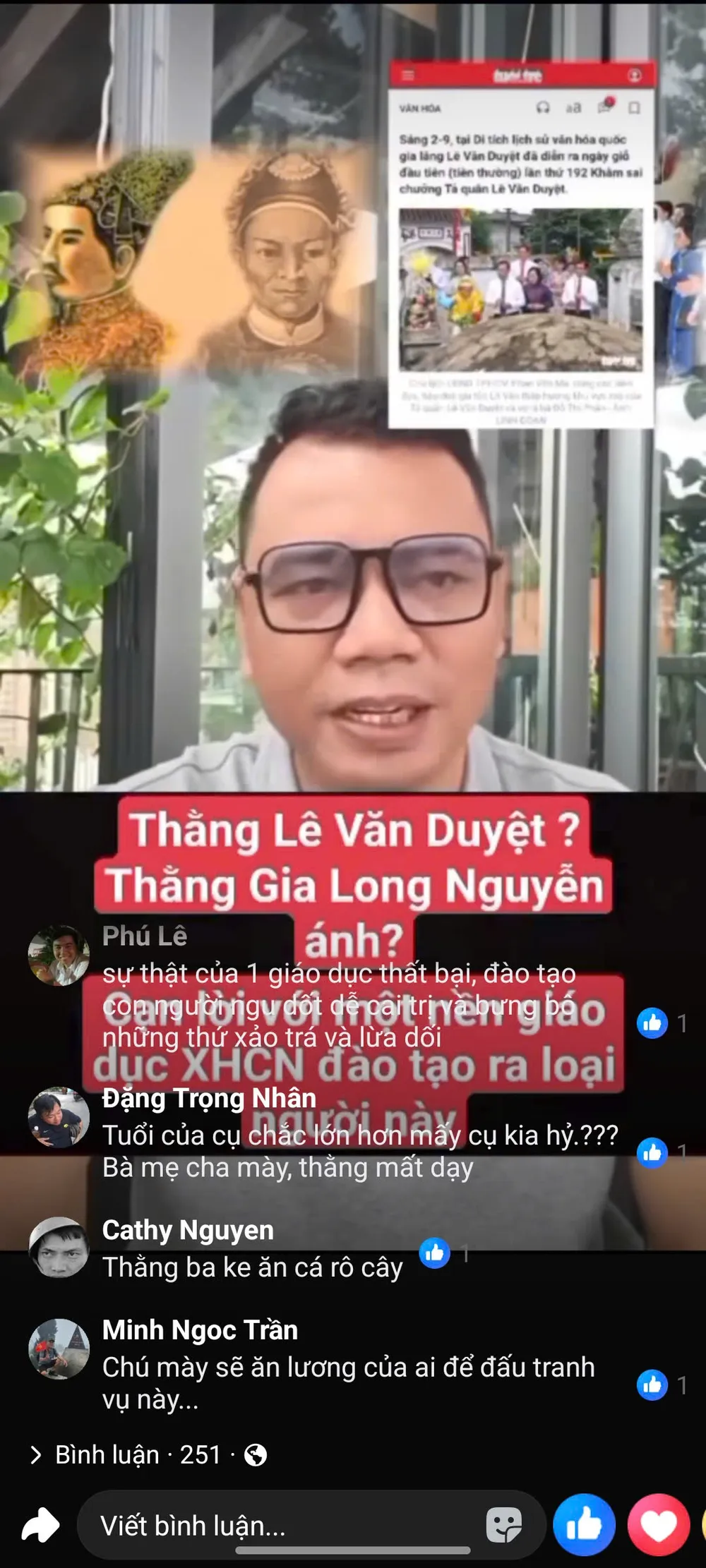 Việc đăng tải thông tin sai lệch về Tả quân Lê Văn Duyệt đang bị xã hội phê phán, và hành vi này được xem là xúc phạm danh nhân, anh hùng dân tộc, vi phạm vào các hành vi bị cấm được quy định trong Luật An ninh mạng" - phía Sở VH&TT TP.HCM thông tin.