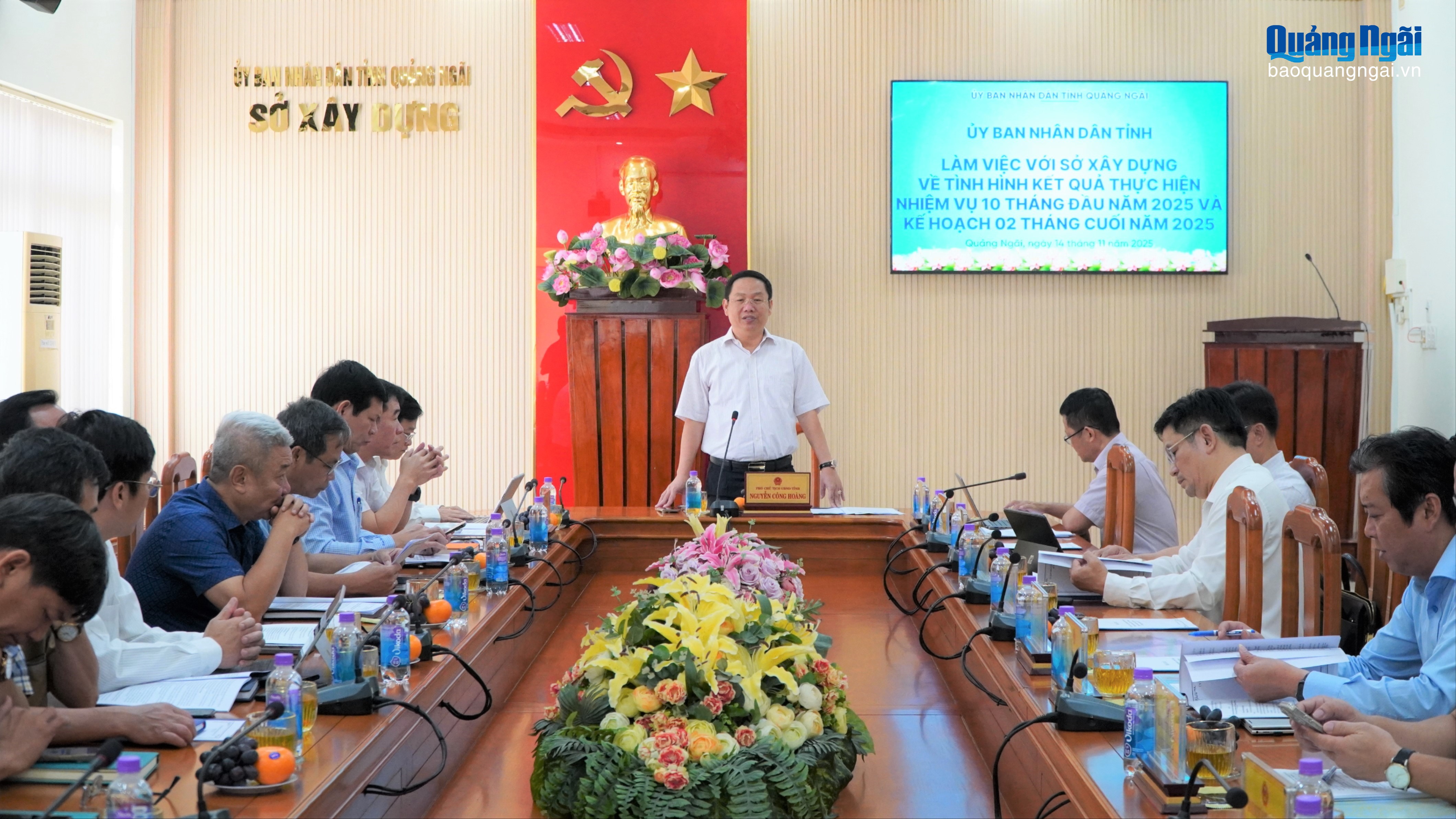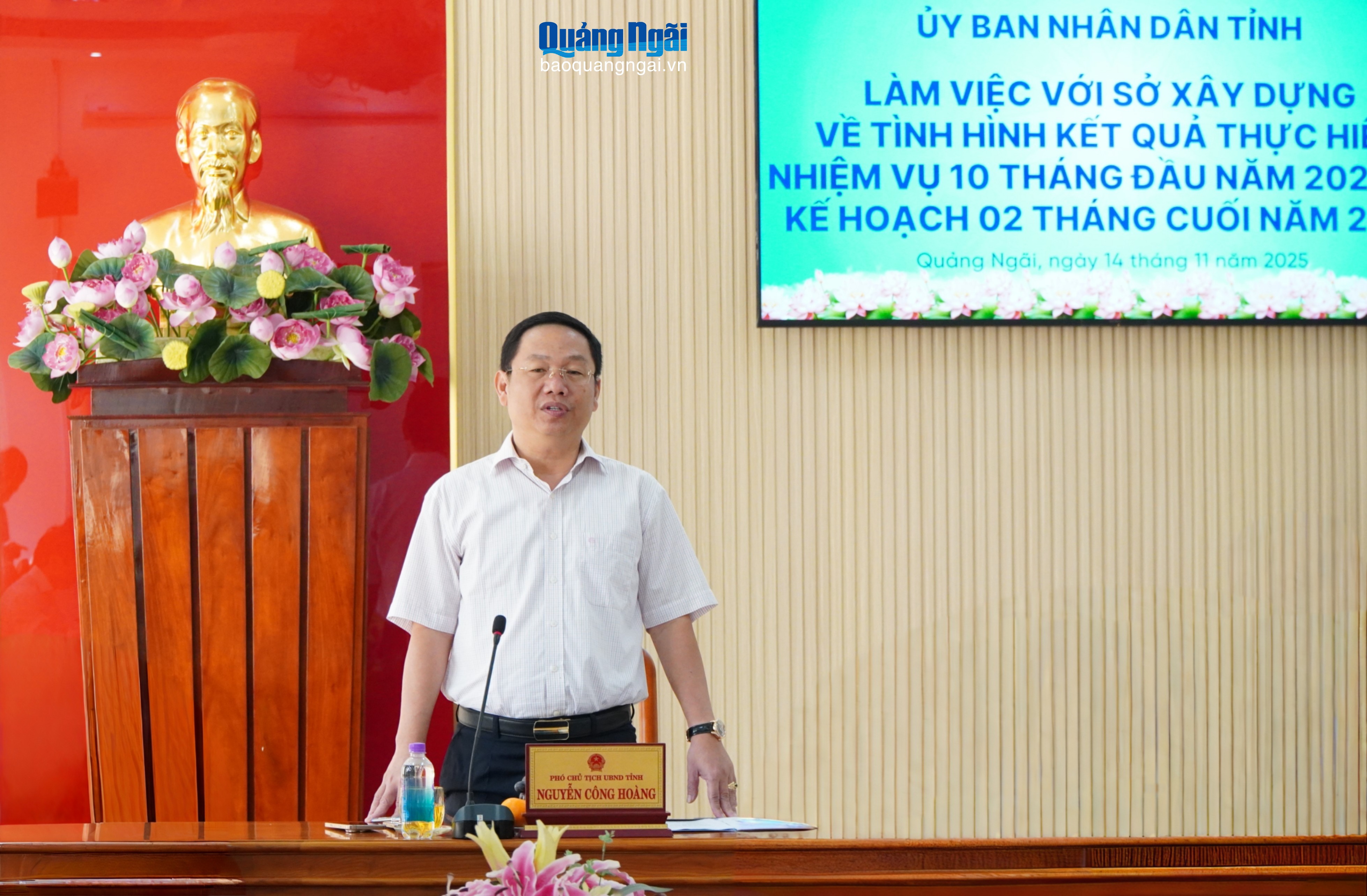 Sáng 14/11, Phó Chủ tịch UBND tỉnh Nguyễn Công Hoàng có buổi làm việc với Sở Xây dựng về kết quả thực hiện nhiệm vụ 10 tháng đầu năm, kế hoạch thực hiện nhiệm vụ 2 tháng cuối năm 2025.
