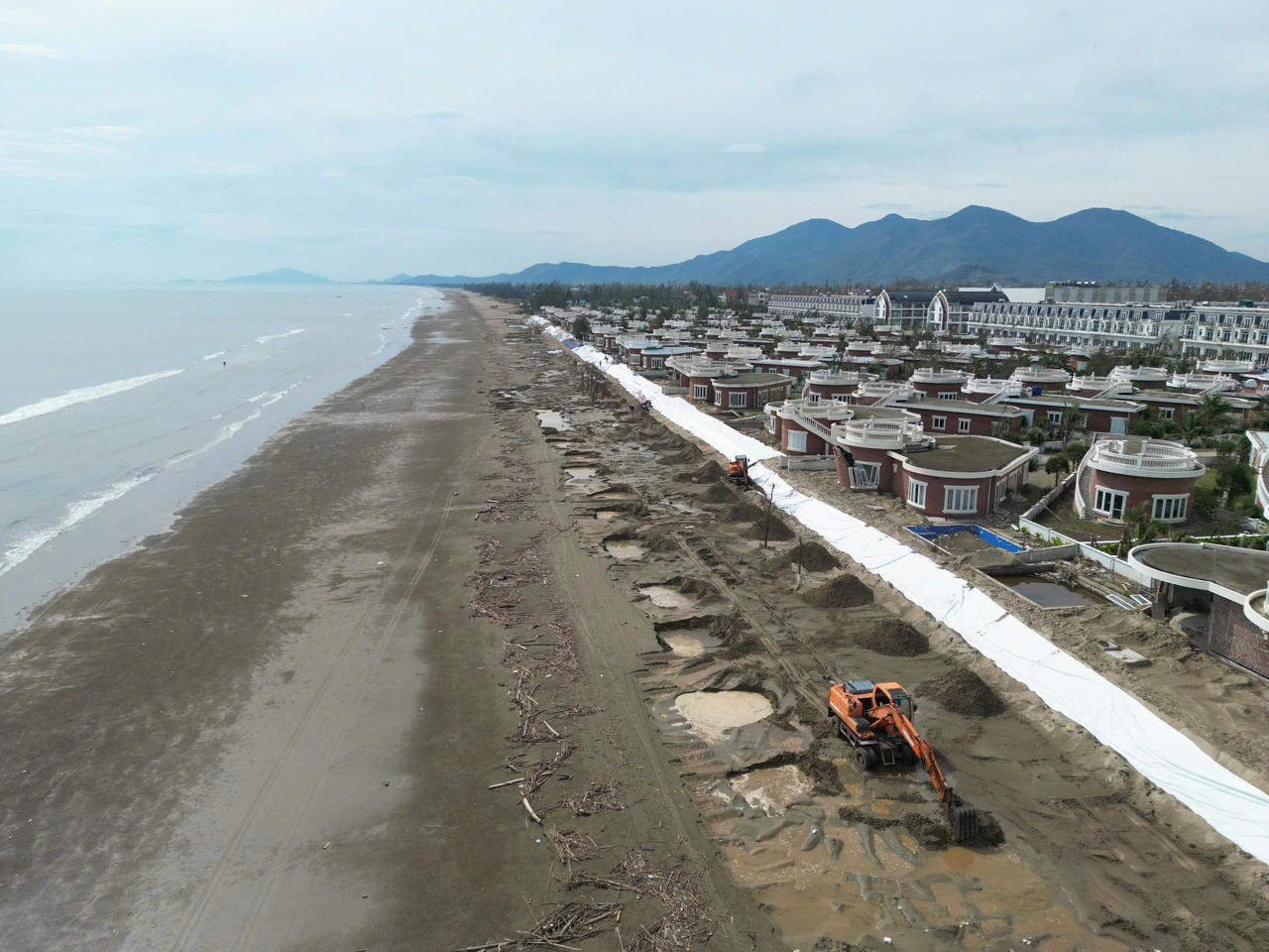 Sau bão chủ đầu tư đã thuê nhân công, máy đào xúc cát trên bãi biển dùng bao tải đắp thành tuyến kè chắn sóng tạm che chắn sóng trước dãy villa hướng biển này.