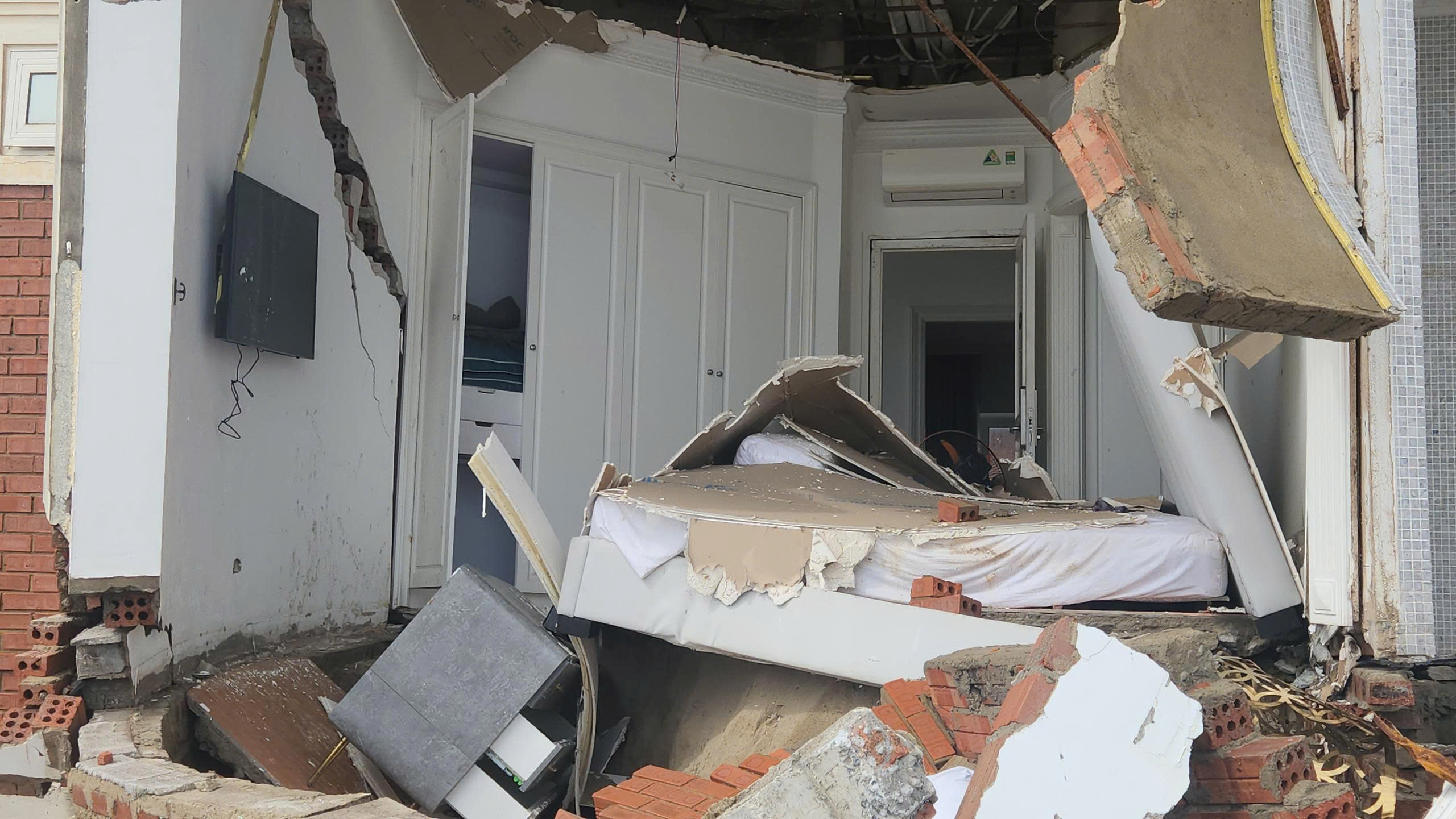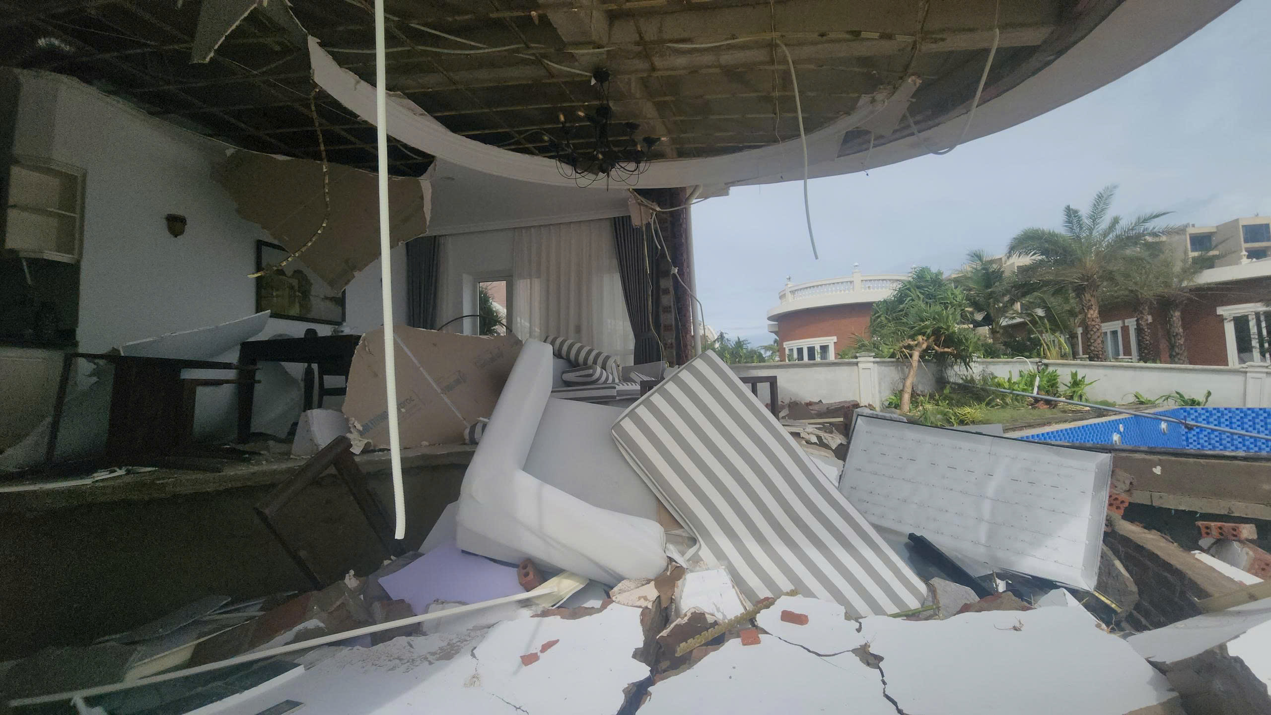 Các vật dụng, nội thất bên trong các gian phòng villa sang trọng như bàn ghế, giường tủ, bồn tắm… bị hư hỏng nặng, xiêu vẹo; nhiều phòng chỉ còn trơ khung tường và đống đổ nát. Được biết, những căn villa này thường để cho thuê vào mùa du lịch, còn hầu như để trống. Sự cố vừa qua không gây thiệt hại về người.