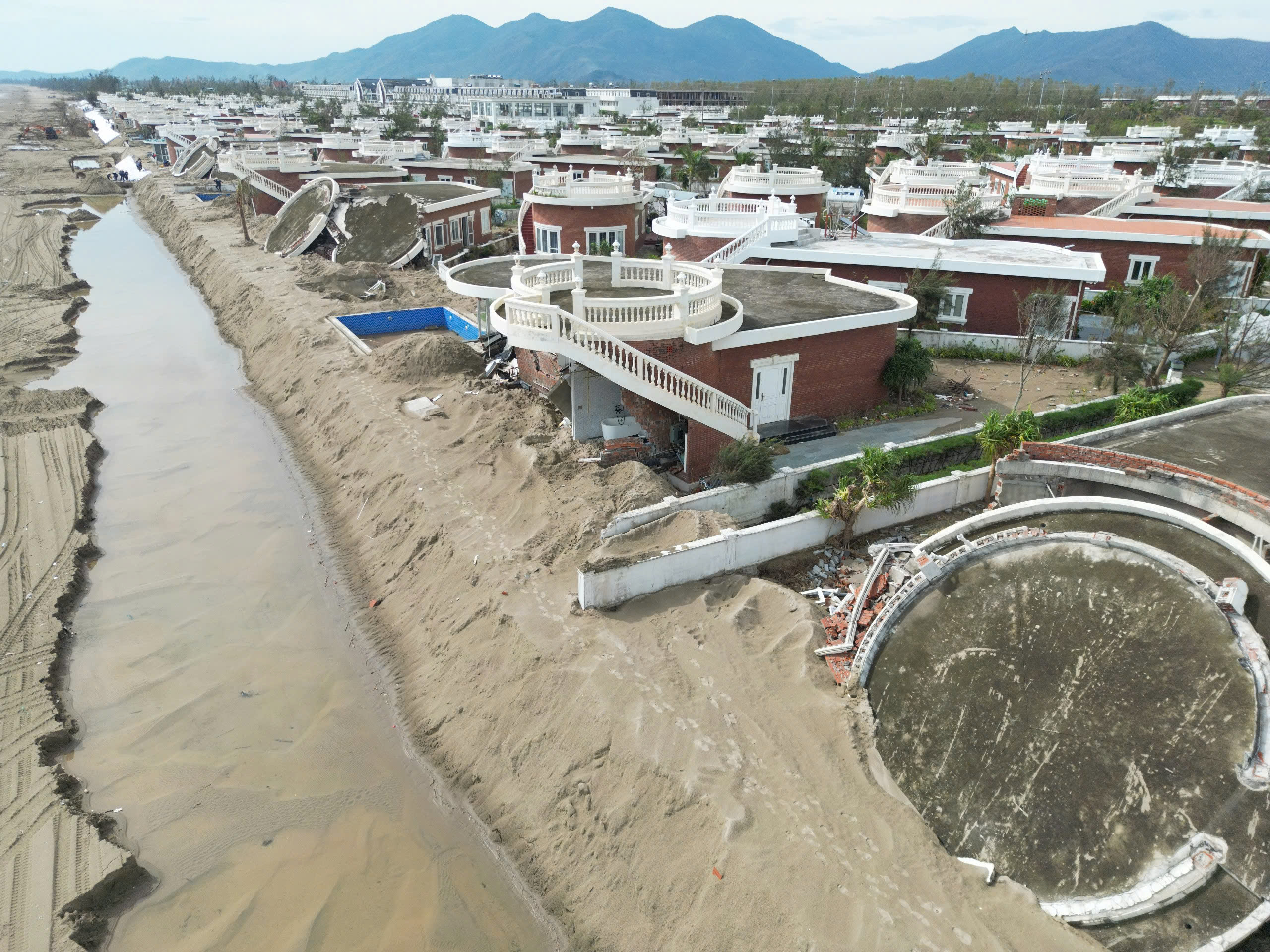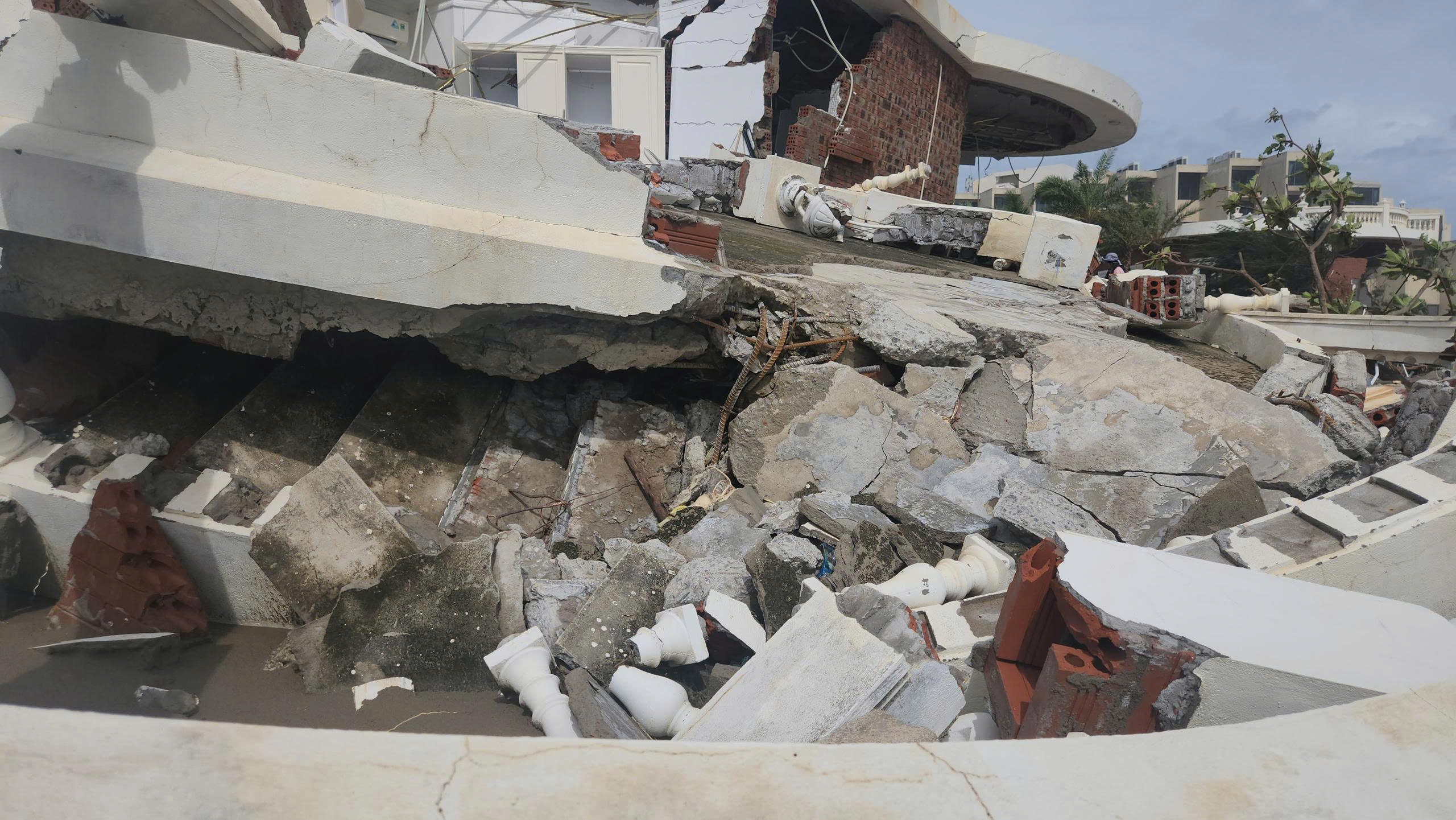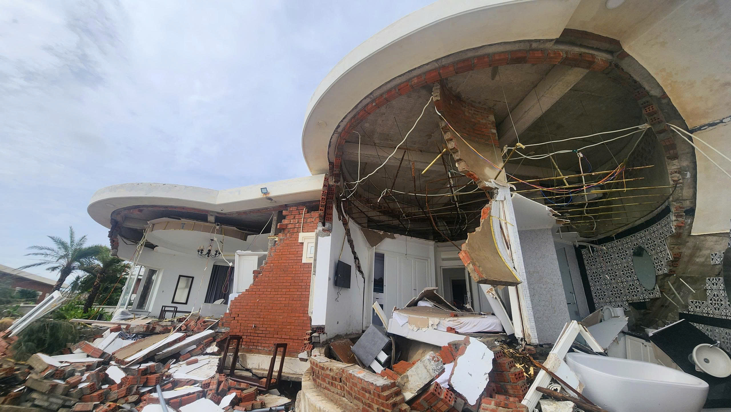 Tại hiện trường, hệ thống tường chịu lực của nhiều căn villa bị nứt gãy, vỡ, đổ sập, lộ ra phần móng được xây dựng khá nông, kết cấu khá đơn giản, bị khoét sâu, hở hàm ếch lớn; các khối bê tông, tường, gạch, đá, sắt thép, cửa... đổ sập nằm ngổn ngang, la liệt.