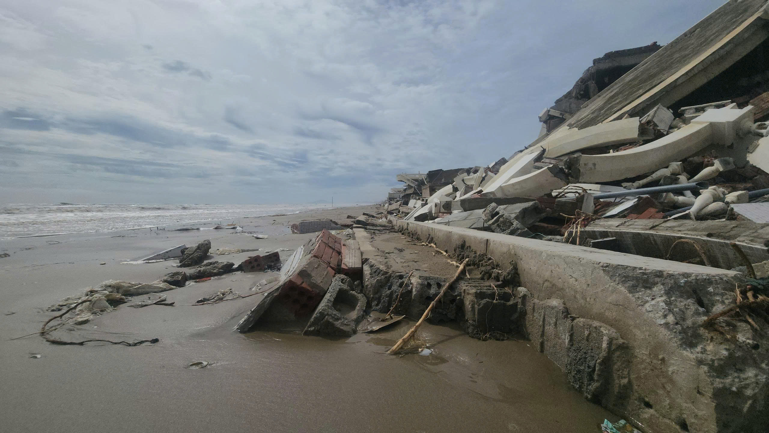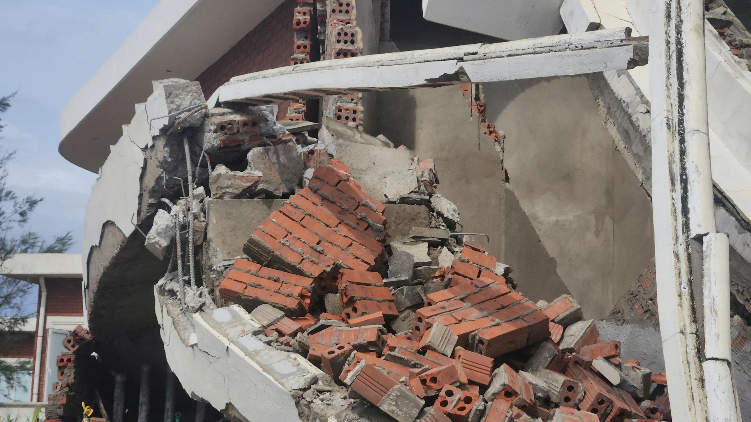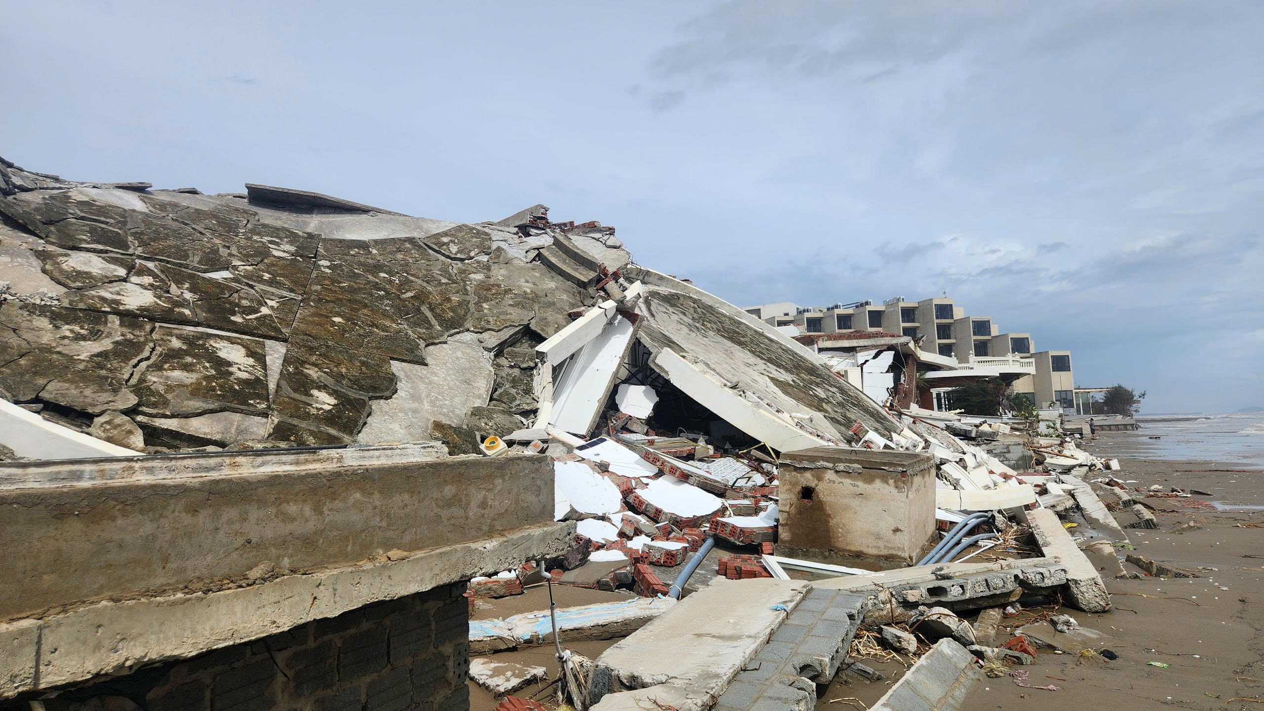 Tại hiện trường, hệ thống tường chịu lực của nhiều căn villa bị nứt gãy, vỡ, đổ sập, lộ ra phần móng được xây dựng khá nông, kết cấu khá đơn giản, bị khoét sâu, hở hàm ếch lớn; các khối bê tông, tường, gạch, đá, sắt thép, cửa... đổ sập nằm ngổn ngang, la liệt.
