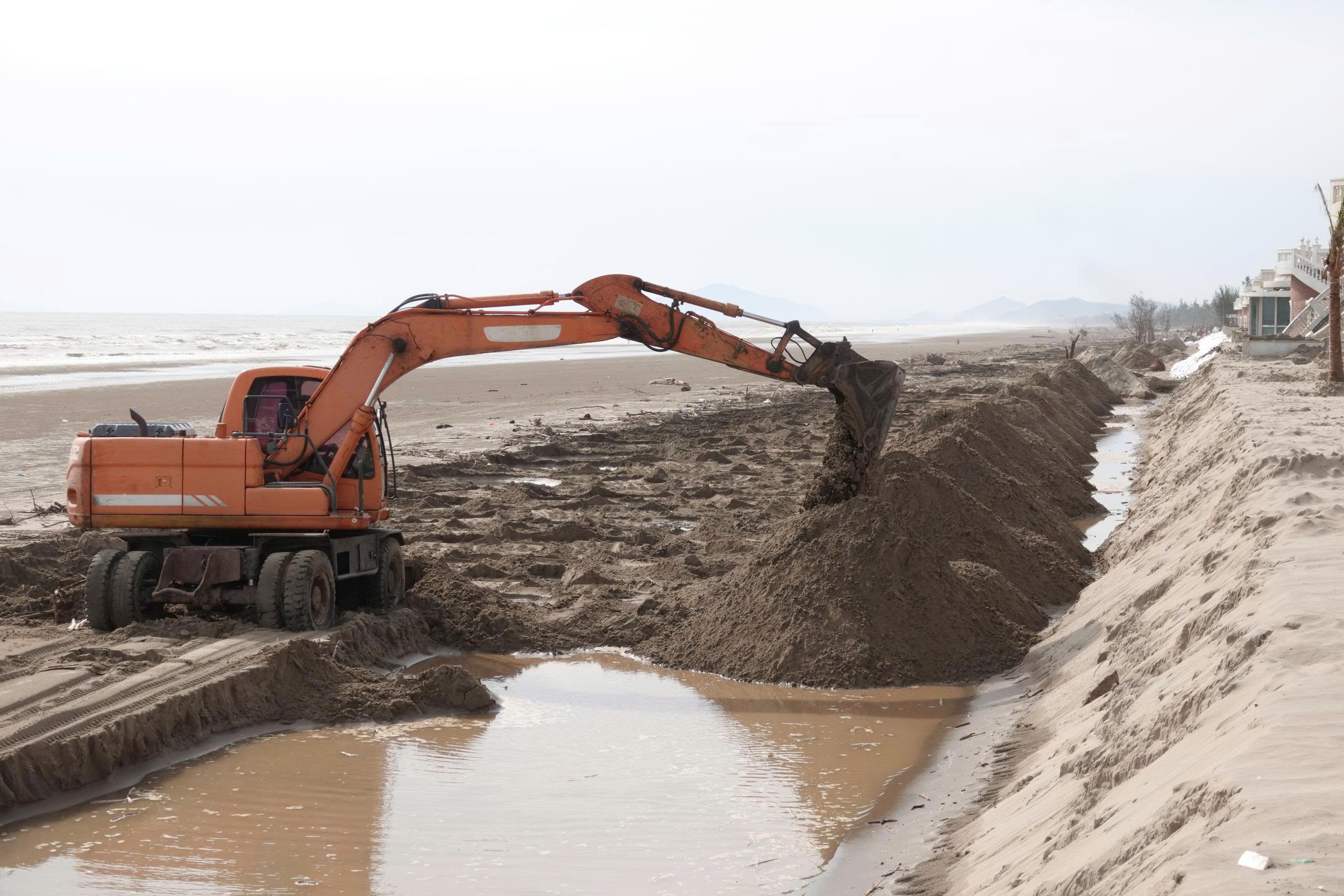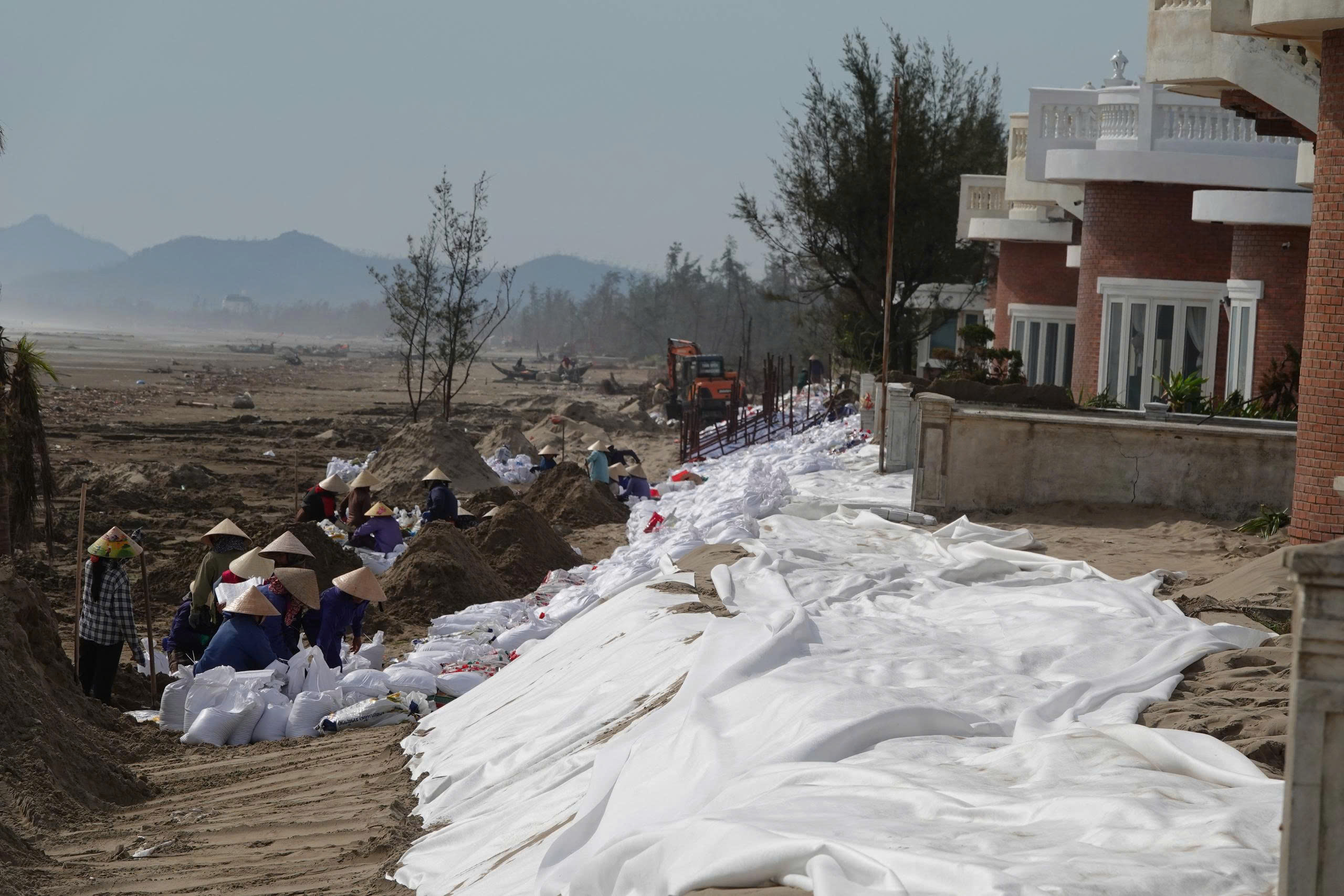Trong những ngày qua, phía chủ đầu tư đã huy động nhân công, phương tiện, máy móc đào xúc cát trên bãi biển, dùng hàng ngàn bao tải cát đắp tuyến kè chắn sóng tạm che chắn sóng phía trước dãy villa hướng ra biển.