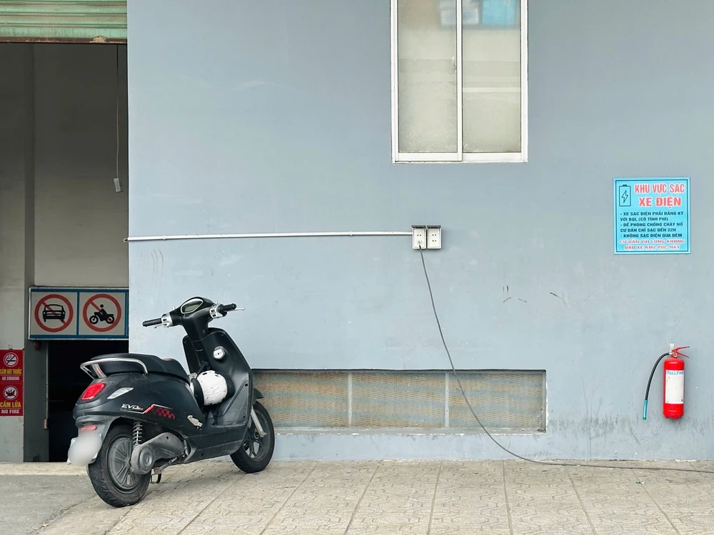Một điểm sạc được gắn trực tiếp vào ổ điện của chung cư. Ảnh: THẢO HIỀN