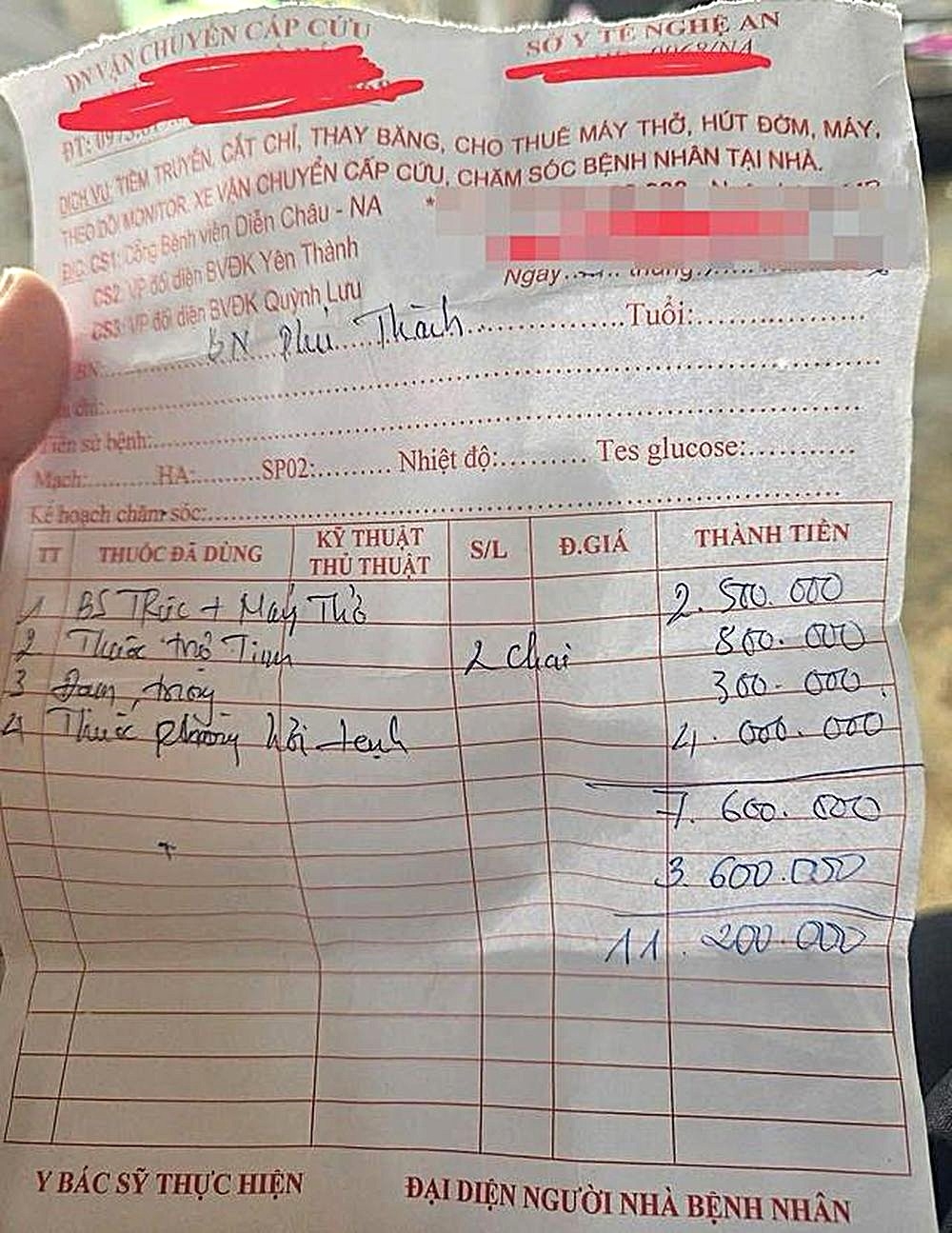Theo thông tin ban đầu, tối ngày 3/1, gia đình chị V. (trú xã An Châu, Nghệ An) liên hệ một dịch vụ y tế tại nhà để hỗ trợ chăm sóc bà nội là bà P.T.D. (SN 1947), trong tình trạng sức khỏe yếu. Trong khoảng thời gian từ 19h đến khoảng 22h cùng ngày, phía dịch vụ yêu cầu thanh toán tổng số tiền 11,2 triệu đồng, gồm cả tiền mặt và chuyển khoản. Các khoản chi được thông báo bao gồm tiền thuê máy thở, thuốc trợ tim, vật tư y tế và một khoản được giải thích là “tiêm thuốc hơi lạnh” giá 4 triệu đồng.