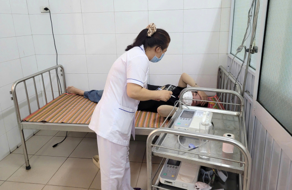 Bác sĩ tại Trung tâm Y tế Hương Trà (TP Huế) chăm sóc cho công nhân nhập viện sau bữa ăn.
