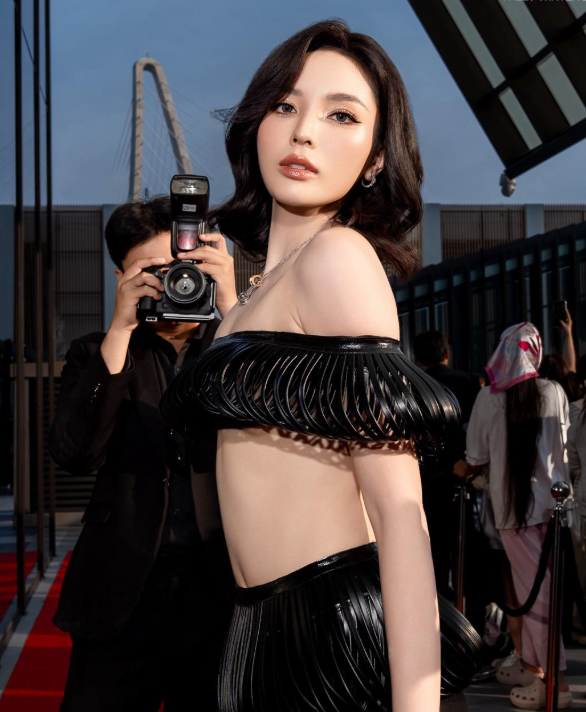 Cô diện thiết kế trễ vai bằng da, điểm nhấn tua rua độc đáo, vừa quyến rũ vừa hiện đại. Bộ cánh tôn lên bờ vai thon và xương quai xanh gợi cảm, giúp cô nổi bật giữa đám đông. Bên cạnh đó, việc phối phụ kiện với hai chiếc vòng cổ mảnh tông vàng - bạc khéo léo tạo thêm điểm nhấn, vừa tinh tế vừa sang trọng.