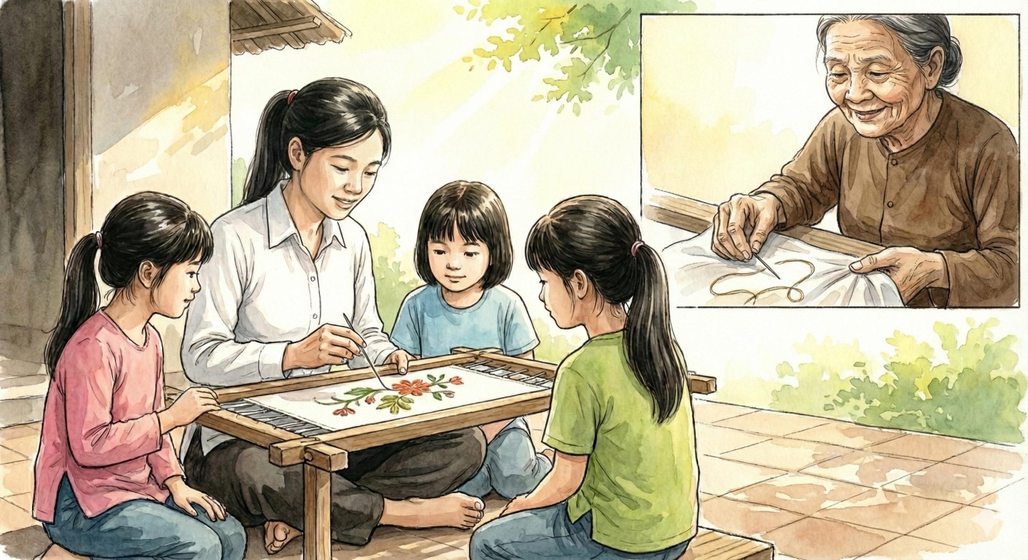 Lành cầm lại cuốn vải, lần đầu thấy tay mình run không phải vì khó, mà vì sợ làm sai. Ngoài hiên, mưa đã ngớt, gió lạnh lại về. Cô gái trẻ ngồi bên bếp, cầm khung thêu, lấy sợi chỉ màu, chọc nhẹ vào mép khăn, thì thầm: