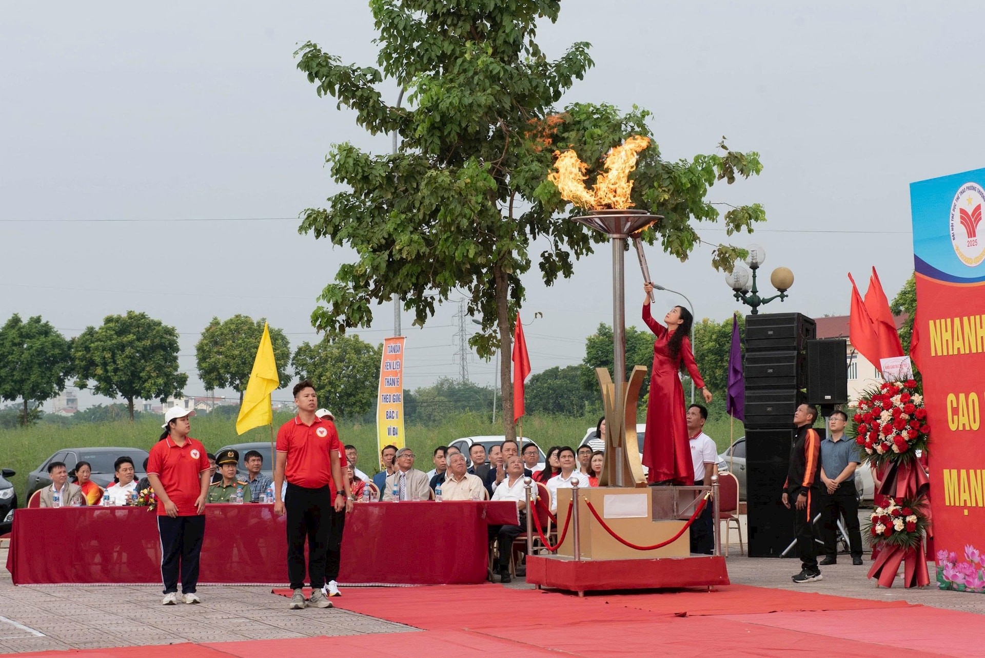 Nghi thức châm đuốc thắp sáng ngọn đuốc Đại hội Thể dục Thể thao phường Thượng Cát. Ảnh Anh Thư