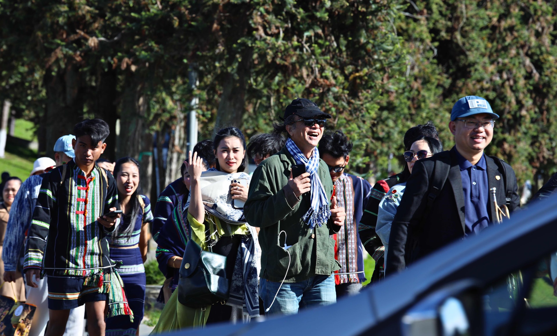 Nhạc sĩ Lê Minh Sơn - Tổng đạo diễn Lễ hội Cồng chiêng Đông Nam Á 2025 hứng khởi hòa mình vào đoàn diễu hành carnival cồng chiêng sáng nay