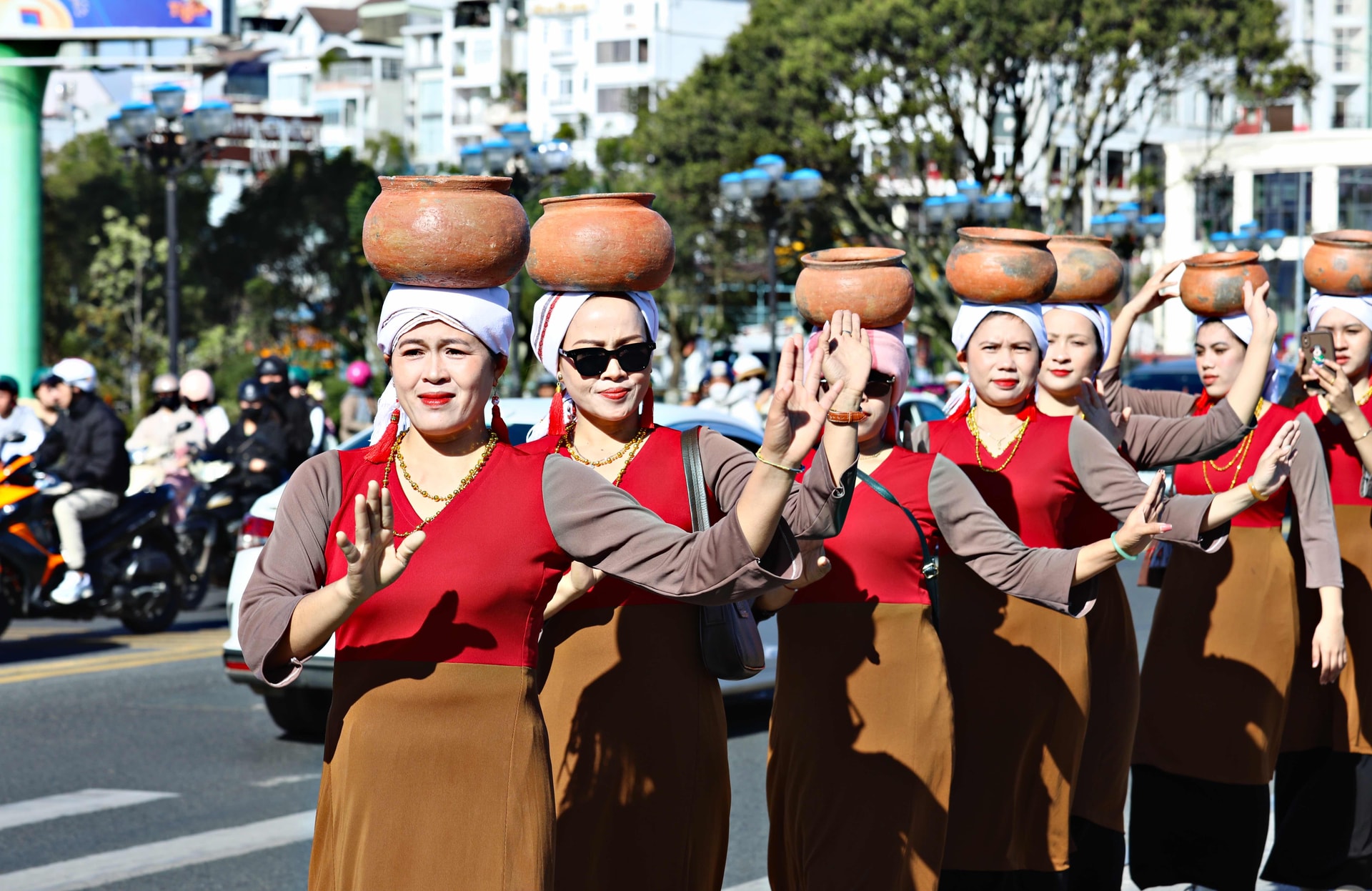 Trên tuyến đường Trần Quốc Toản ven hồ Xuân Hương, các đoàn nghệ nhân đến từ nhiều địa phương trong khu vực xuất hiện trong trang phục truyền thống, vừa diễu hành vừa trình diễn cồng chiêng, múa xoang,..