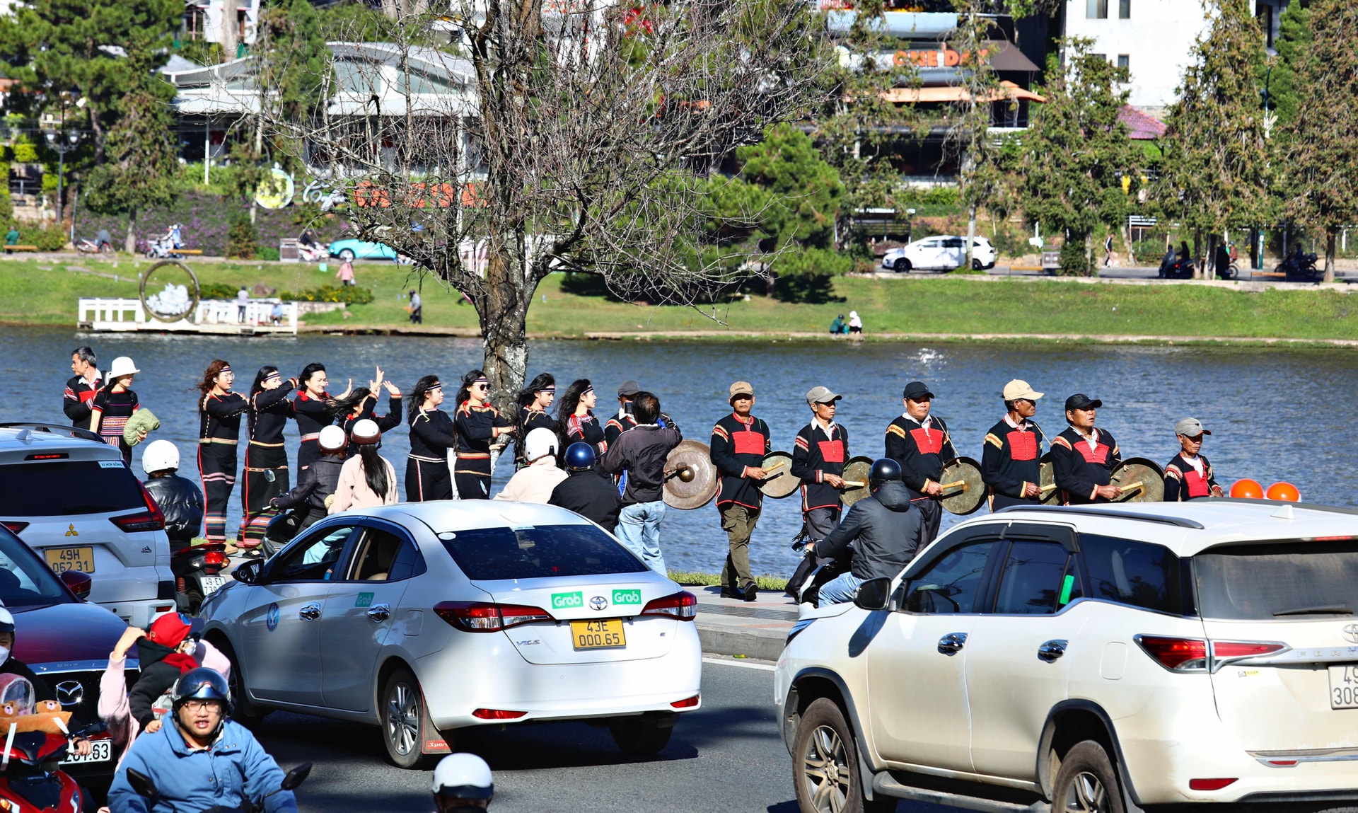 Nhiều đoàn nghệ nhân trình diễn quanh hồ Xuân Hương, phường Xuân Hương - Đà Lạt sáng nay. Ảnh: Chính Thành