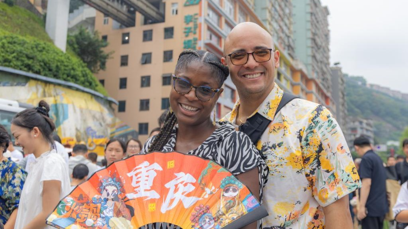 Du khách nước ngoài chụp ảnh check-in tại thành phố Trùng Khánh, Trung Quốc. (Ảnh: Tân Hoa Xã)