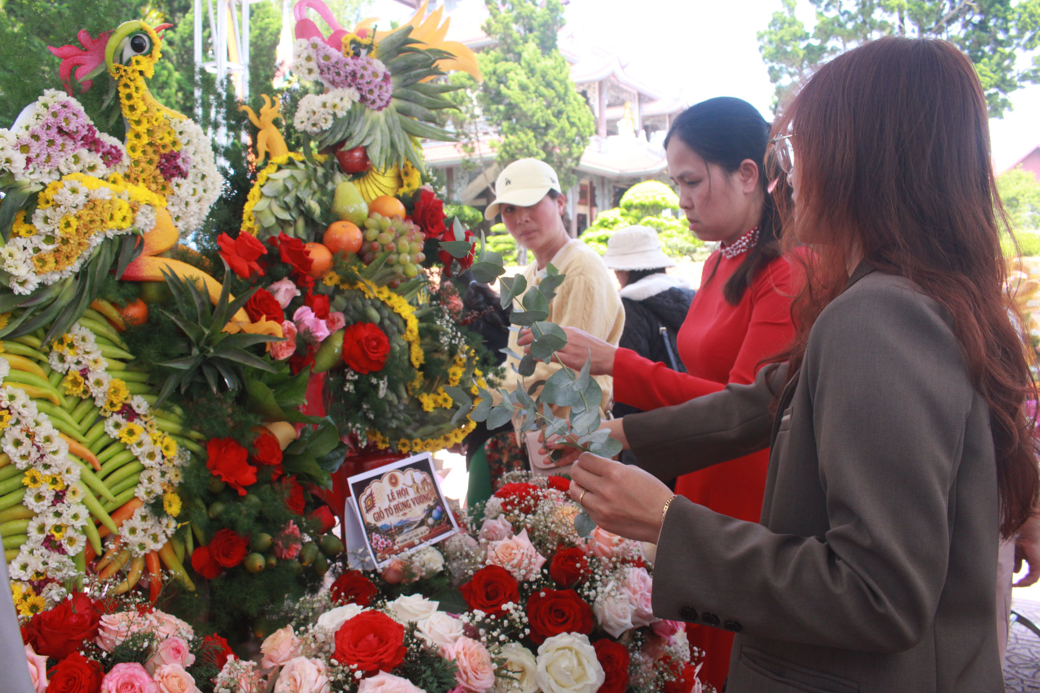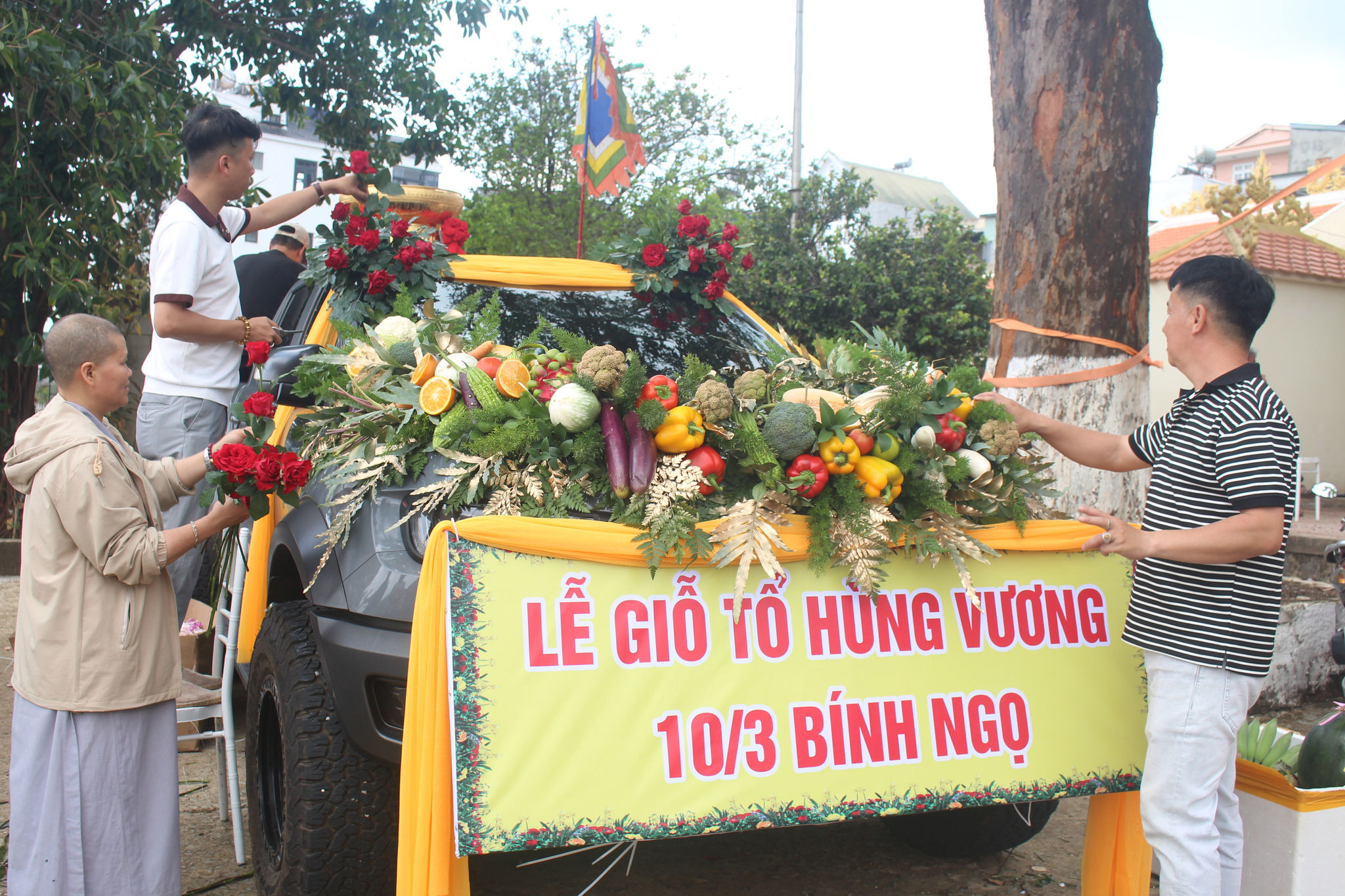 Bên cạnh đó, 2 xe hoa được trang trí rực rỡ từ hoa, trái, rau, củ cũng được chuẩn bị công phu, sẵn sàng cho lễ rước và diễu hành diễn ra vào sáng 10/3 âm lịch, trên đoạn đường gần 2 km từ UBND phường Cam Ly – Đà Lạt (29 Thi Sách) đến Đền thờ Quốc Tổ Hùng Vương (đường Ngô Quyền), trước khi các nghi lễ Giỗ Tổ được tiến hành.