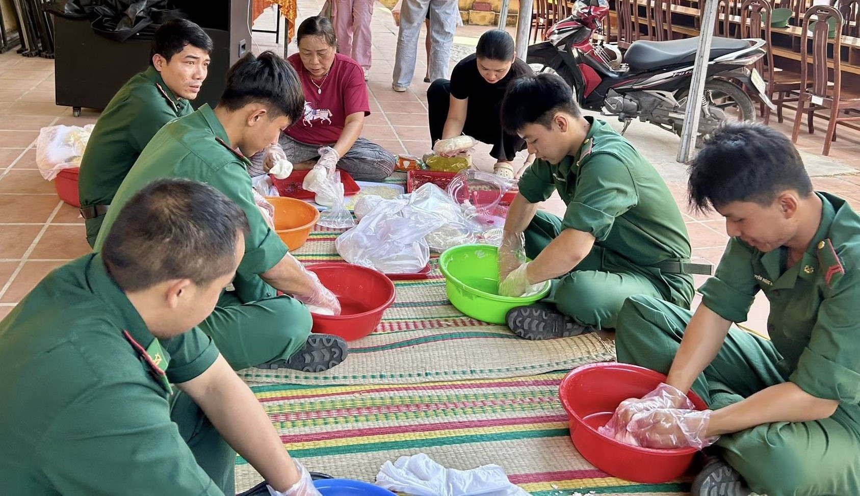 Chiến sĩ Đồn Biên phòng Hòa Minh cùng tham gia làm bánh giầy trong Lễ hội Giỗ Tổ Hùng Vương tại Phan Rí Cửa