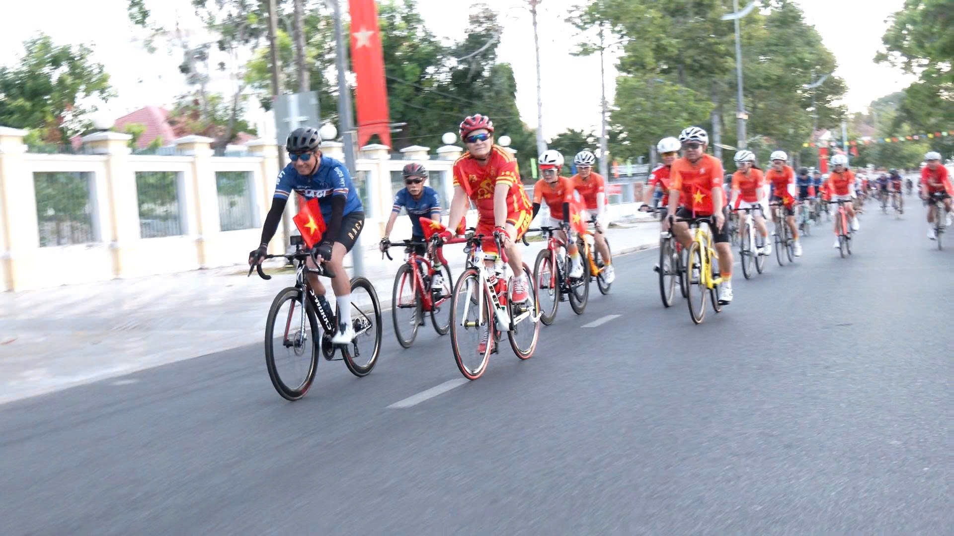 Những chiếc xe trang trí cờ đỏ sao vàng nổi bật diễu hành qua các tuyến đường chính trong trật tự, an toàn, lan tỏa thông điệp rèn luyện thể thao theo gương Bác Hồ, xây dựng lối sống khỏe mạnh, tích cực.