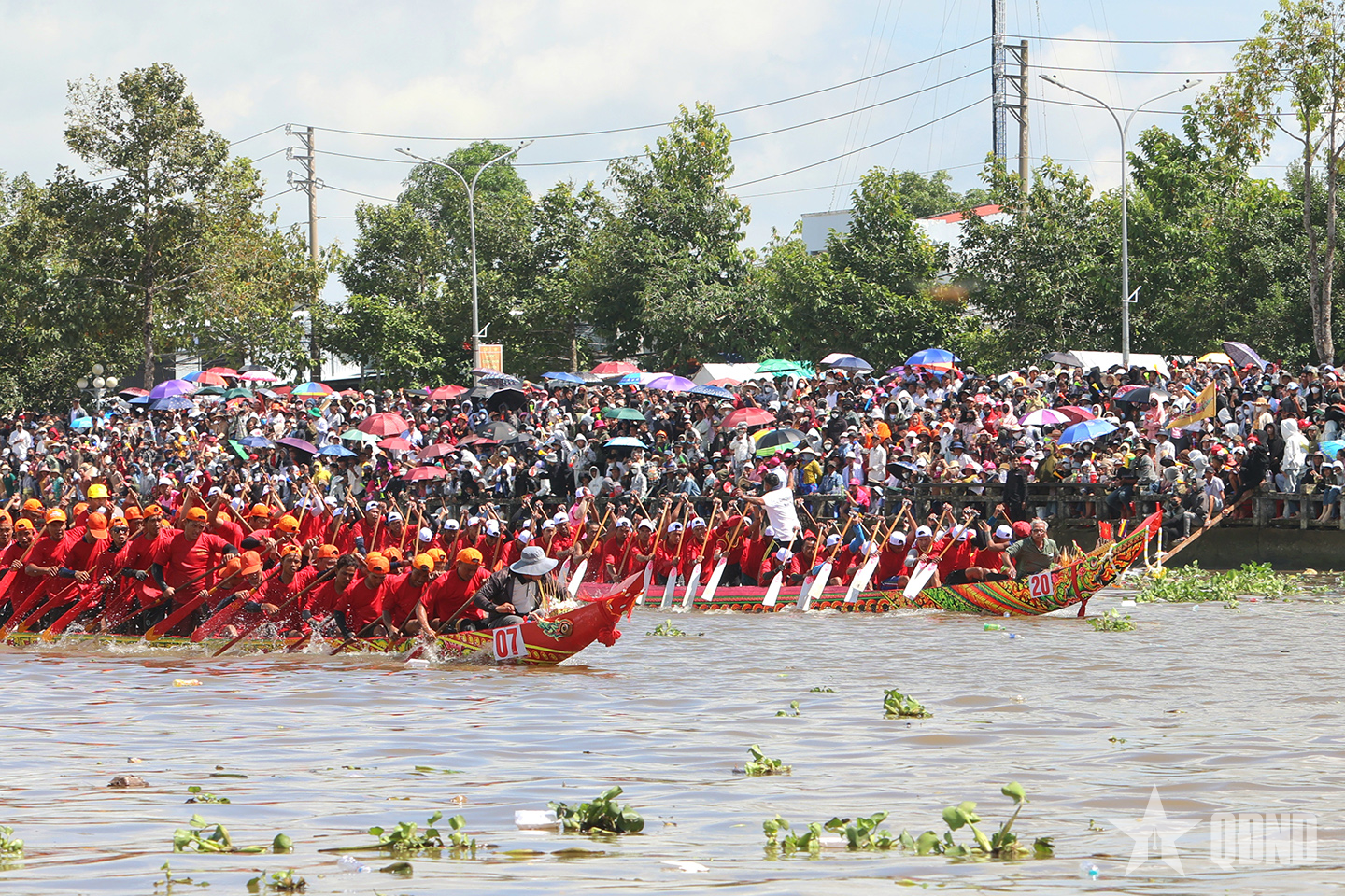 Ngay từ sáng sớm, hàng chục nghìn người dân, du khách và người hâm mộ đã có mặt hai bên bờ sông cổ vũ, tạo nên bầu không khí lễ hội sôi động, rực rỡ sắc màu truyền thống Khmer Nam Bộ.