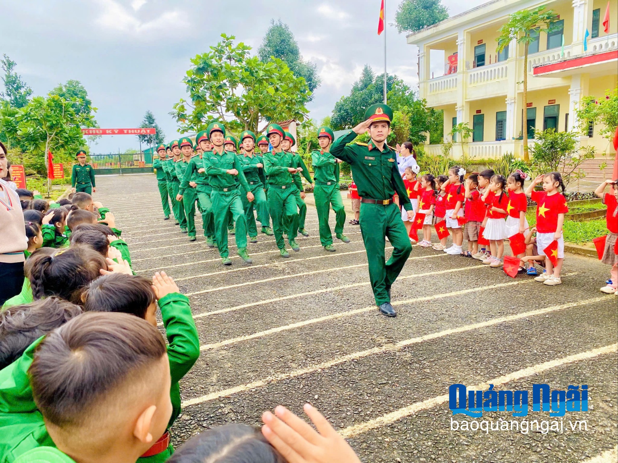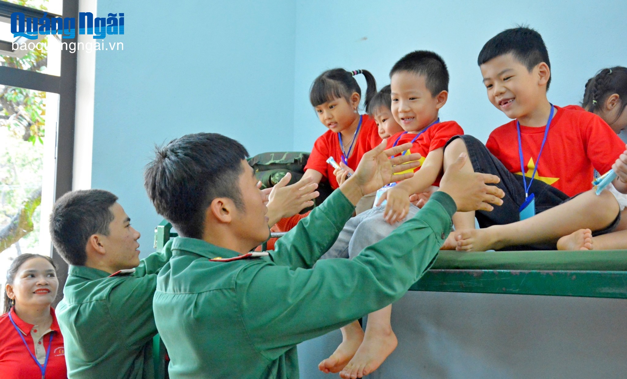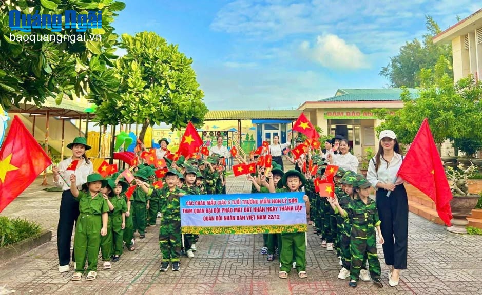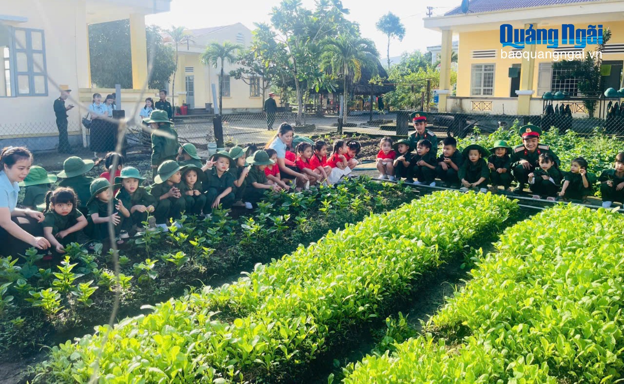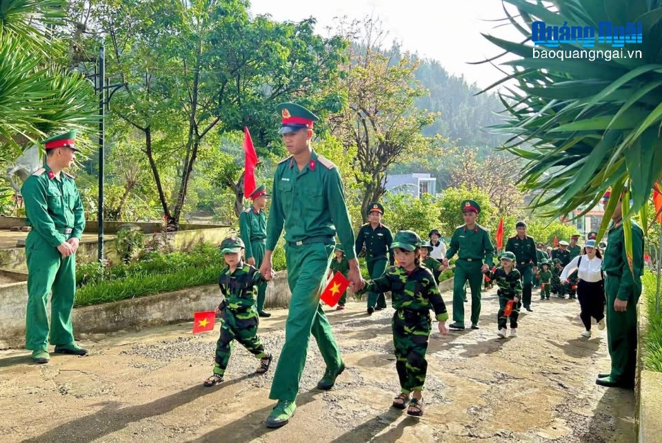 Các cháu học sinh đến tham quan doanh trại quân đội trên địa bàn Lý Sơn.