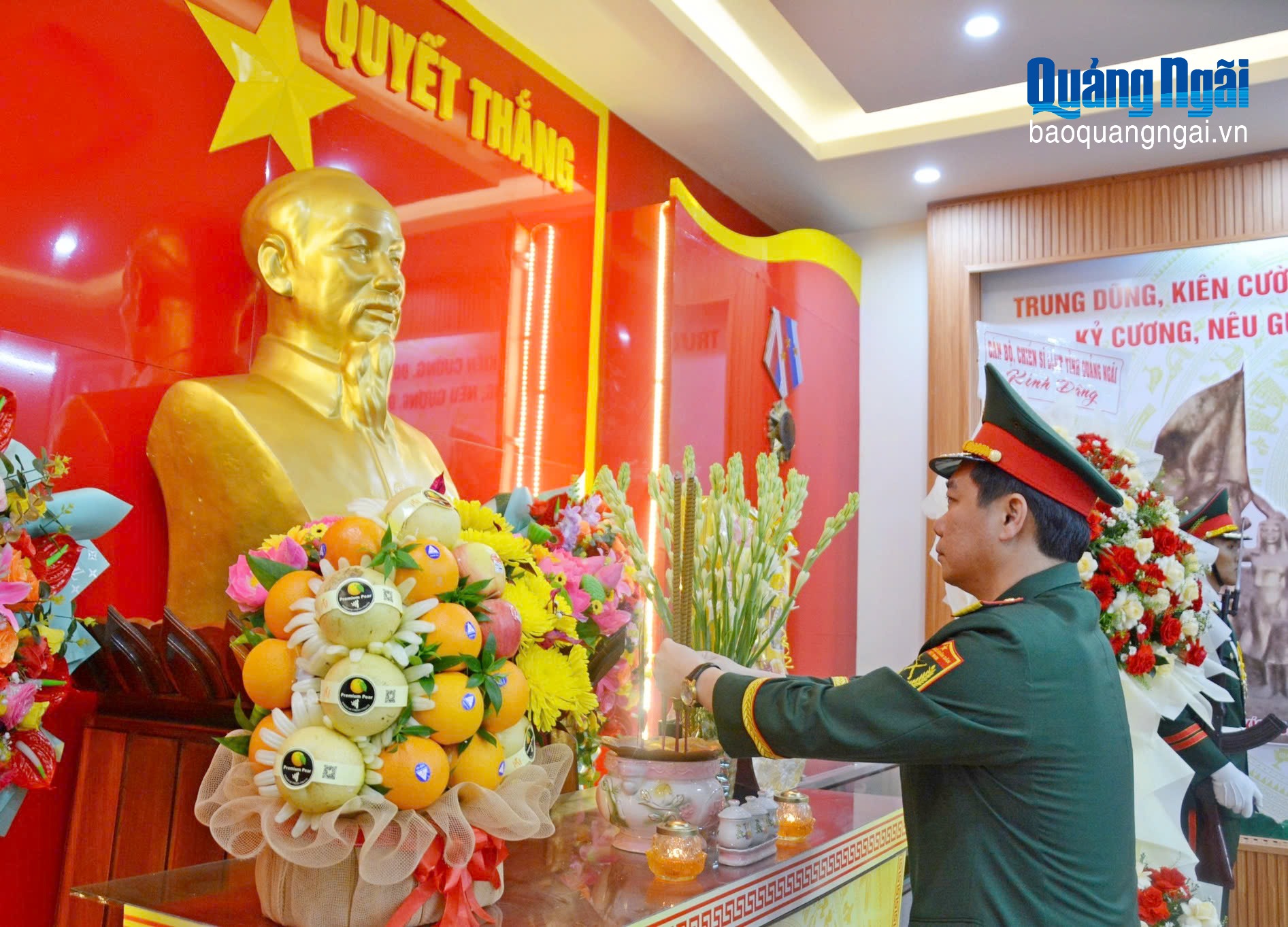 Thượng tá Trần Thế Phan - Ủy viên Ban Thường vụ Tỉnh ủy, Chỉ huy trưởng Bộ CHQS dâng hoa tri ân Chủ tịch Hồ Chí Minh và các anh hùng liệt sĩ tại Nhà Truyền thống Lực lượng vũ trang tỉnh.