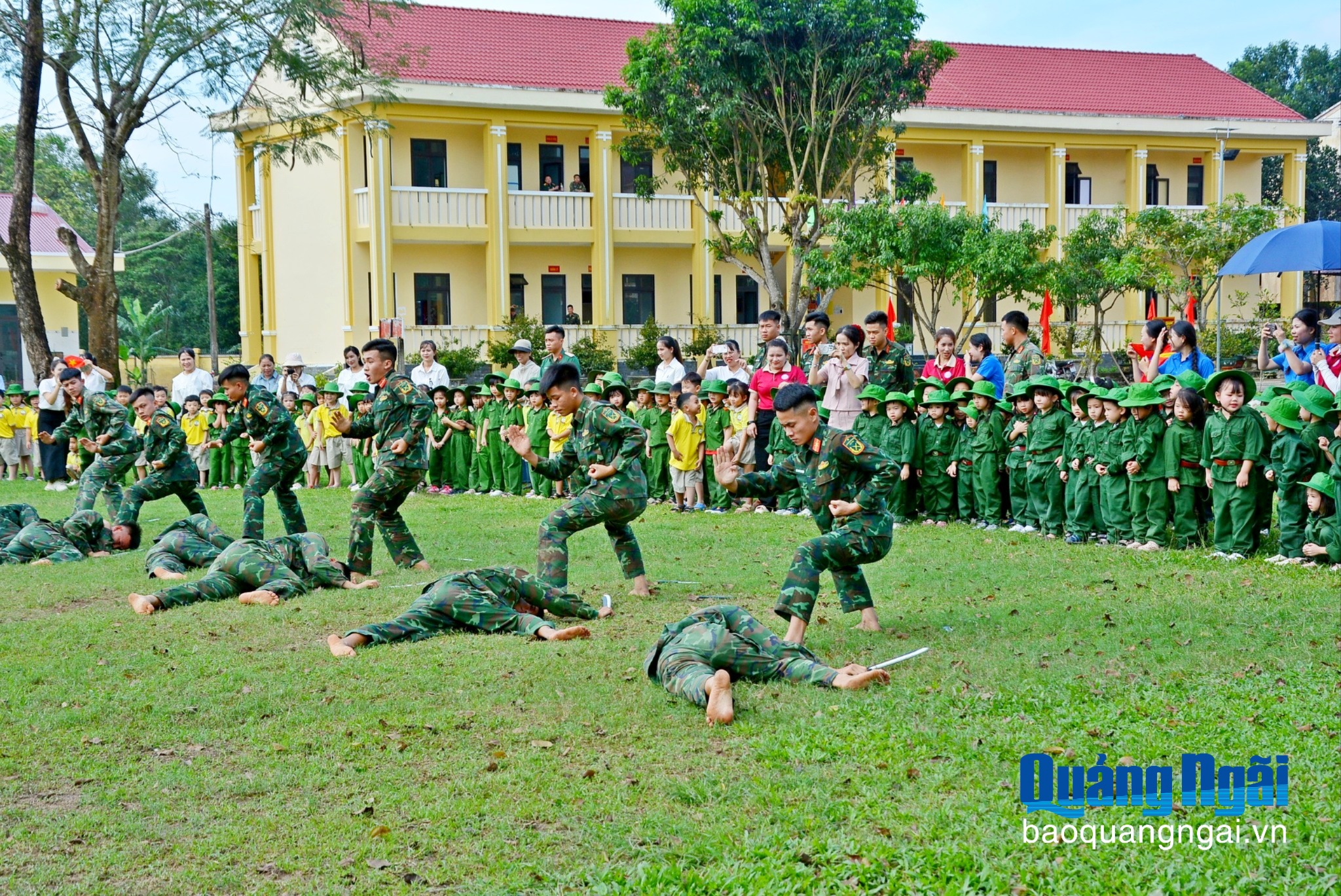 Các cháu học sinh tham quan, trải nghiệm sinh hoạt của của bộ đội tại doanh trại và được xem bộ đội biểu diễn võ thuật.