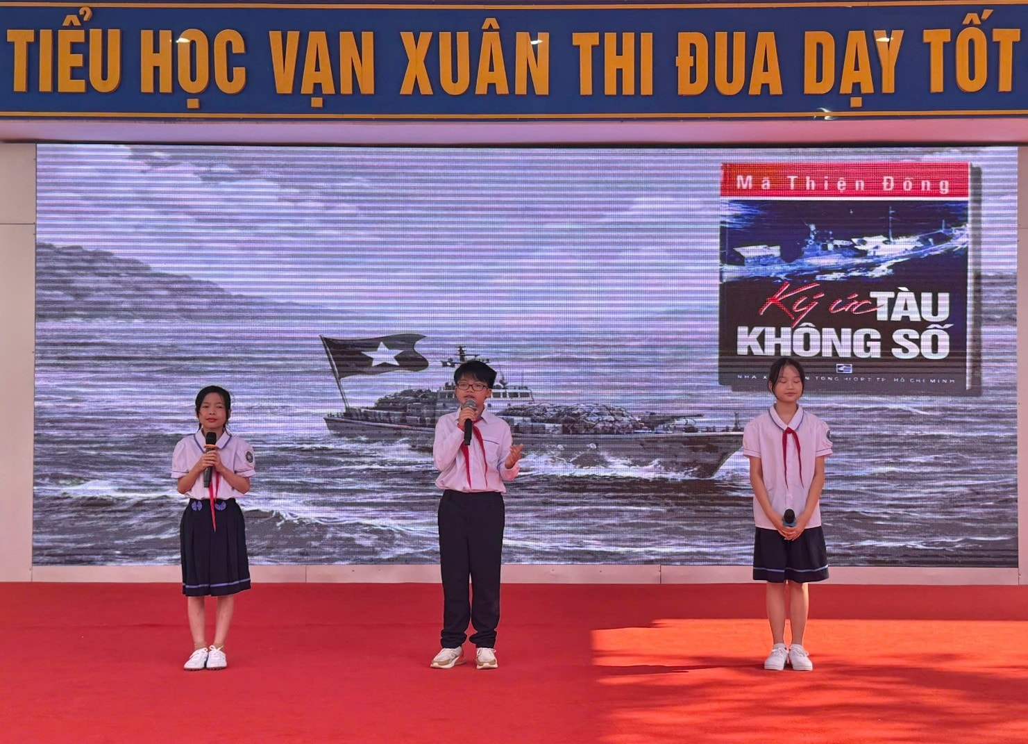Học sinh Trường Tiểu học Vạn Xuân giới thiệu cuốn sách “Ký ức tàu không số” của nhà văn Mã Thiện Đồng. Ảnh: ĐH.