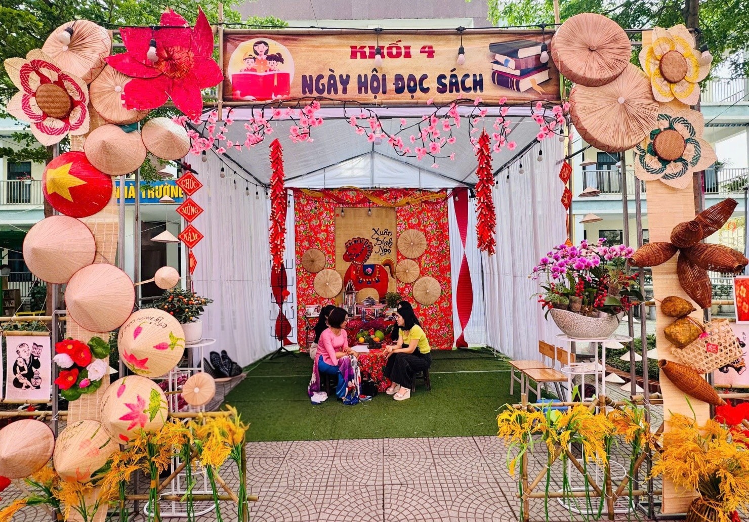 Không gian các gian hàng truyền thống được tái hiện một cách sinh động với những nguyên vật liệu gần gũi với tự nhiên như lá cọ, cây tre, lá dừa, lá chuối… mang nét đặc trưng đậm màu sắc mùa xuân cùng nhiều món ăn dân dã mang đậm hương vị quê hương do chính thầy cô, phụ huynh và các em học sinh cùng chuẩn bị.