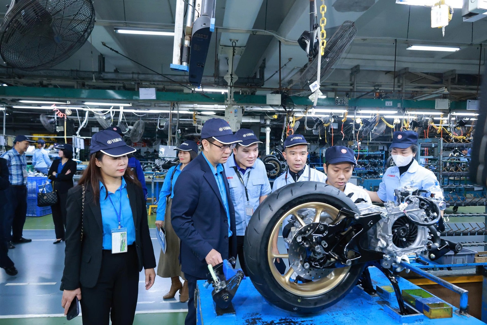Chủ tịch Liên đoàn Lao động thành phố Hà Nội Nguyễn Văn Thắng thăm, động viên công nhân Công ty TNHH Yamaha Motor Việt Nam dịp đầu năm mới 2026. Ảnh: M Quân