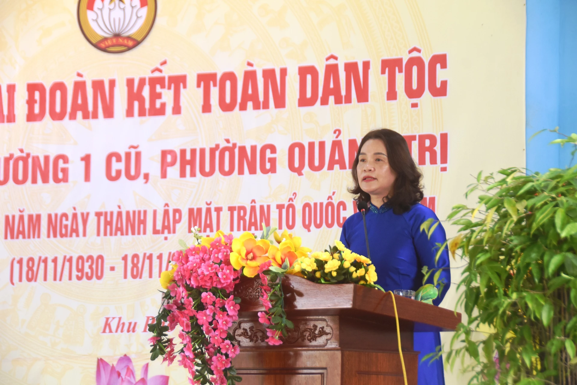 Phát biểu tại ngày hội, đồng chí Chủ nhiệm Ủy ban Kiểm tra Tỉnh ủy Hồ Thị Thu Hằng ghi nhận, biểu dương những kết quả đạt được trong thực hiện các cuộc vận động, phong trào thi đua yêu nước của nhân dân Khu phố 3. Đồng chí đề nghị thời gian tới, cấp ủy Chi bộ, Ban Công tác mặt trận, nhân dân khu phố tiếp tục phát truy truyền thống, sức mạnh khối đại đoàn kết toàn dân tộc trong giai đoạn mới; đẩy mạnh tuyên truyền thực hiện tốt các chủ trương, chính sách của Đảng, Nhà nước.