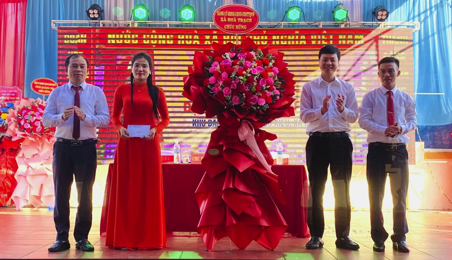 Lãnh đạo xã Hòa Trạch tặng hoa và quà cho khu dân cư Phúc Kiều - Ảnh: N.L