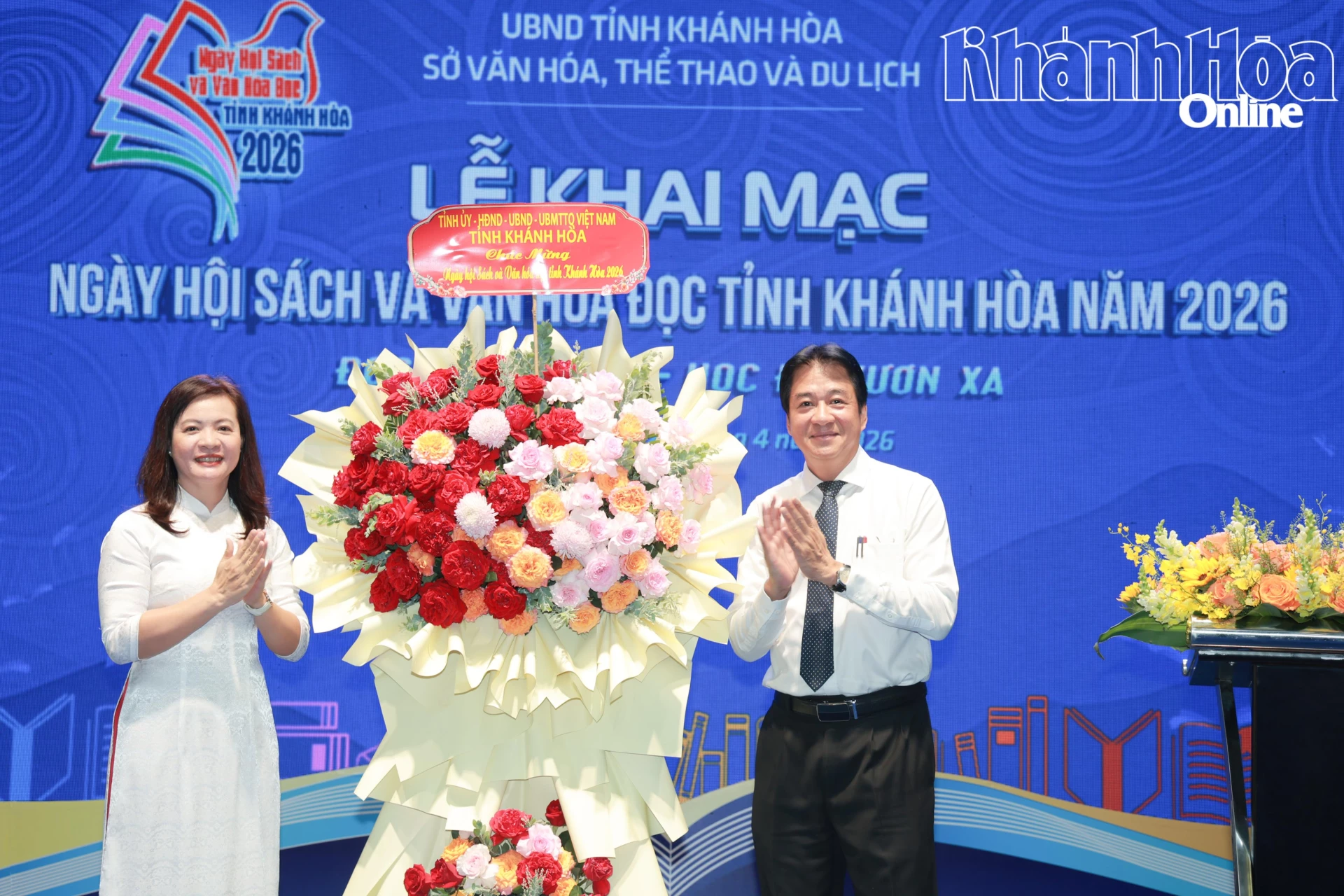 Đồng chí Nguyễn Long Biên thay mặt lãnh đạo tỉnh tặng hoa chúc mừng Ngày hội Sách và Văn hóa đọc tỉnh Khánh Hòa năm 2026.