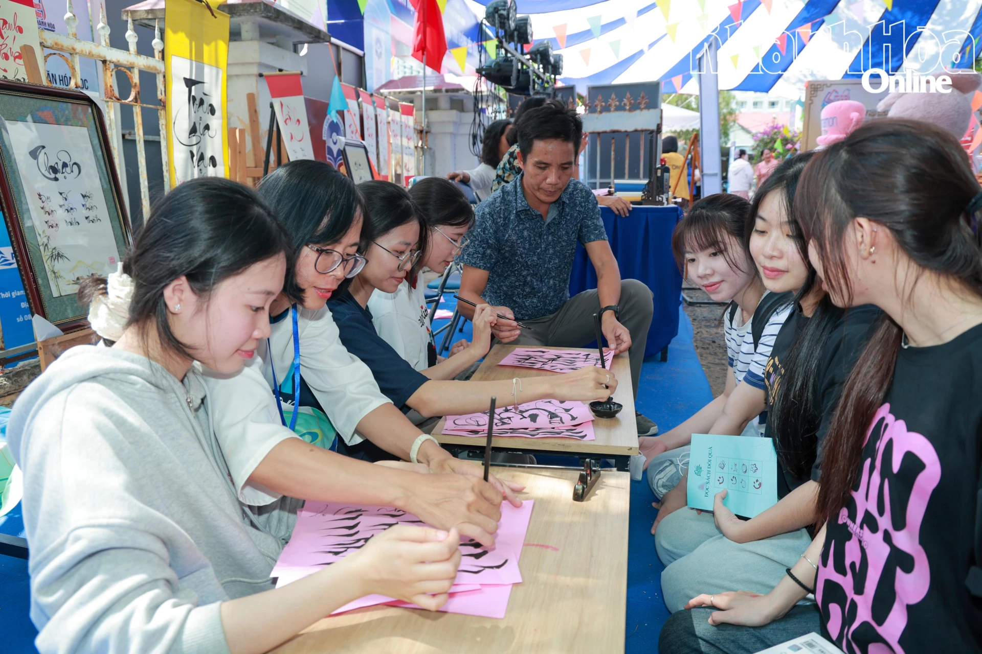 Các bạn trẻ được hướng dẫn cách viết thư pháp.