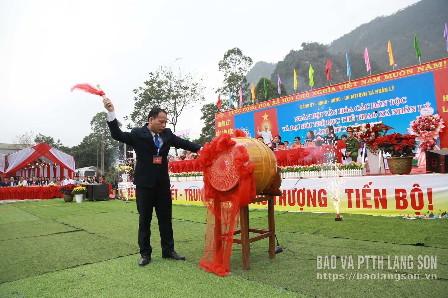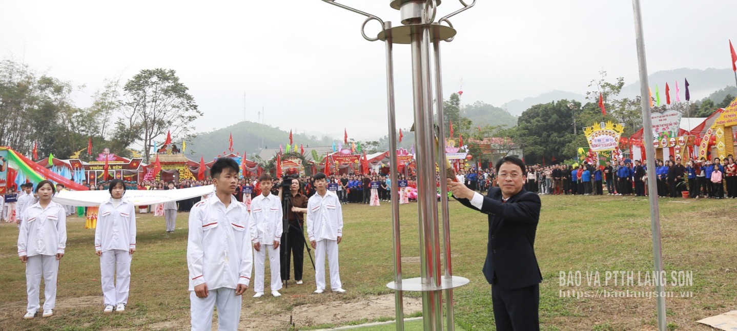Đồng chí Bí thư Đảng ủy xã Nhân Lý thắp đài lửa tại Ngày hội văn hóa các dân tộc và Đại hội thể dục, thể thao lần thứ X năm 2026