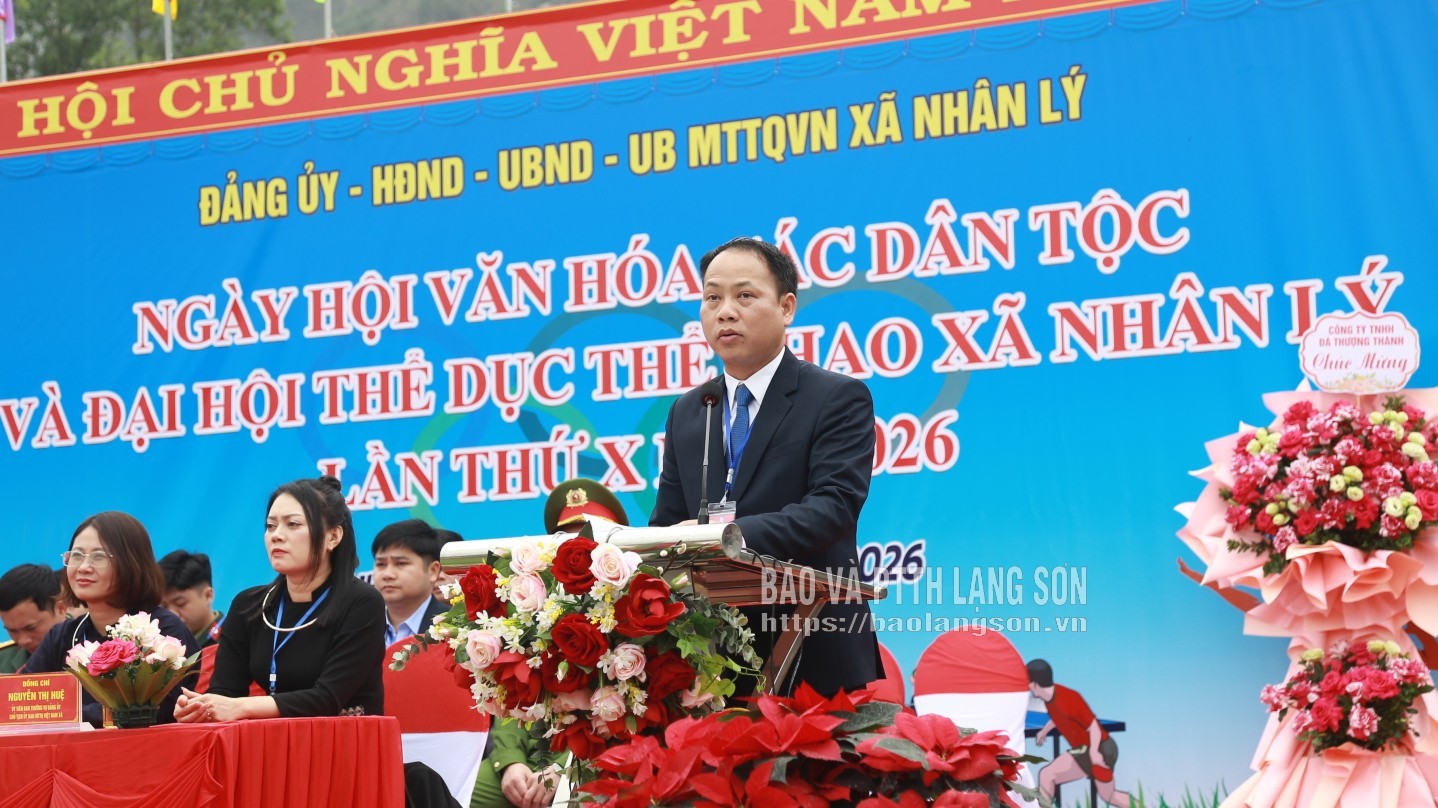Đồng chí Chủ tịch UBND xã Nhân Lý phát biểu khai mạc Ngày hội văn hóa các dân tộc và Đại hội thể dục, thể thao lần thứ X năm 2026