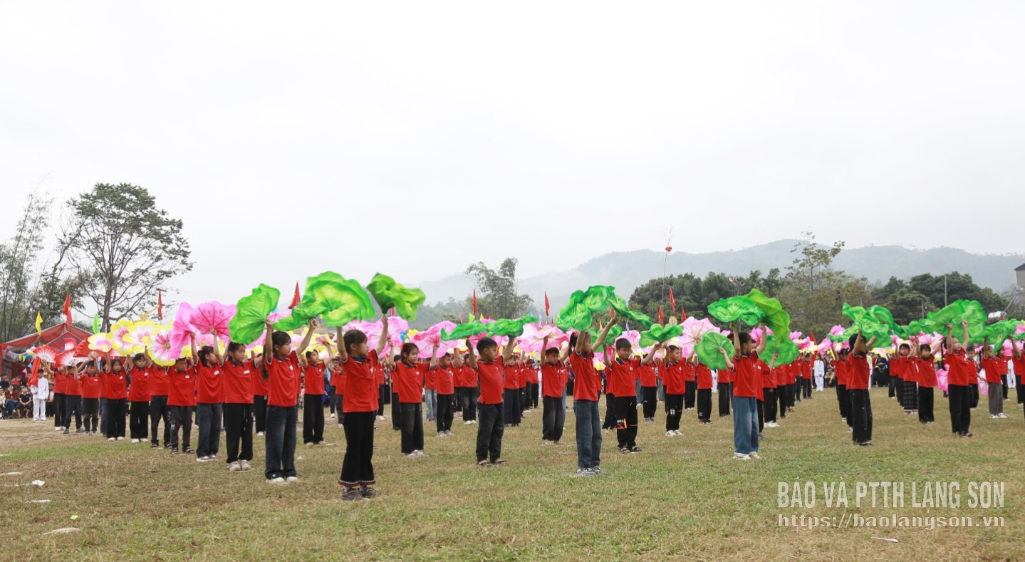Màn đồng diễn tại lễ khai mạc do các em học sinh Trường Tiểu học Mai Sao, xã Nhân Lý thực hiện
