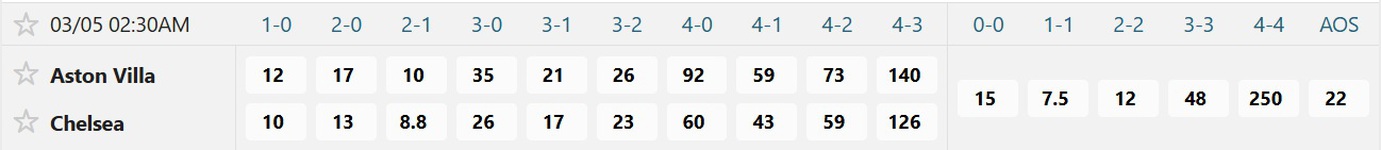 Tỉ số được ưa chuộng nhất là 1-1 với mệnh giá đặt 1 ăn chỉ 7.5, trong lúc 2-2 ăn 12, còn 0-0 ăn 15. Cừa thắng cho Aston Villa không mấy nổi trội khi 2-1 có mệnh giá đặt 1 ăn 10, 1-0 ăn 12, còn 2-0 ăn 17. Ngược lại, nhiều người ủng hộ Chelsea thắng khi tỉ số 1-2 có mệnh giá đặt 1 ăn 8.8, trong lúc 0-1 ăn 10, còn 0-2 ăn 13.