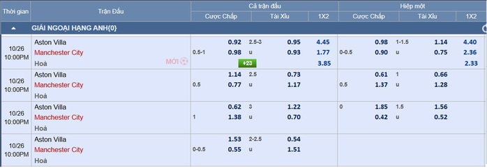 Aston Villa - Manchester City diễn ra lúc 21 giờ, ngày 26-10 (giờ Việt Nam) . Aston Villa đang có phong độ cao sẽ hướng đến chiến thắng quan trọng khi tiếp đón Manchester City. Aston Villa đang sống nhờ hơi thở của Villa Park khi sân nhà trở thành pháo đài giúp họ ghi những chiến thắng quan trọng trước Burnley và Fulham.