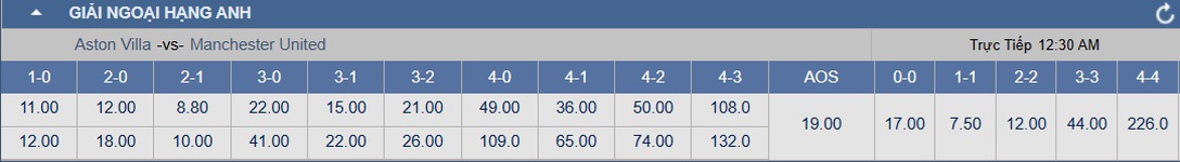 Tỉ số được ưa chuộng nhất là 1-1 với mệnh giá đặt 1 ăn 7.5, trong lúc 2-2 ăn 12, còn 0-0 ăn đến 17. Cửa thắng cho Aston Villa rất cuốn hút khi 2-1 có mệnh giá đặt 1 ăn 8.8, 2-0 ăn 12, còn 1-0 ăn 11. Ngược lại, không nhiều người dám theo Manchester United khi 1-2 có giá ăn 10, 0-1 ăn 11, còn 0-2 ăn đến 18.