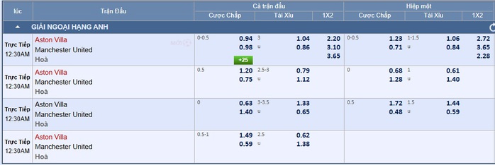 Tỉ lệ trận đấu ban đầu Aston Villa chỉ chấp Manchester United đồng nửa, lún tiền (ăn 85, thua đủ). Đến trưa nay, tỉ giá không biến động nhiều, vẫn là Aston Villa chấp Manchester United đồng nửa, ăn 9, thua đủ. Dù sao thì chọn chủ nhà vẫn an toàn hơn vì phong độ đỉnh cao của họ.
