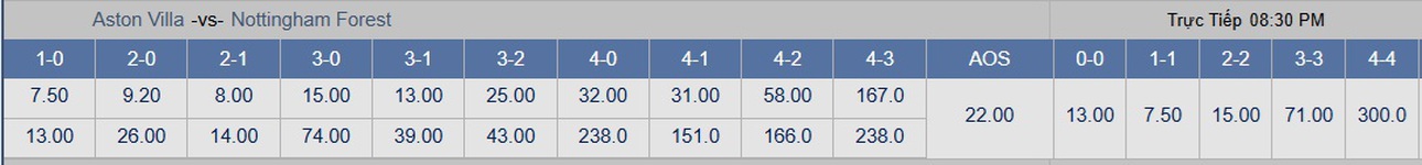 Tỉ lệ trận đấu ngay từ đầu Aston Villa chỉ chấp Nottingham Forest nửa trái, ăn 82, thua đủ. Đến tối qua, các hãng đột nhiên tạo biến động khi Aston Villa chấp thành nửa một, ăn đủ và thua 85. Cần phải thấy là giá cả của 2 mức này là ngang nhau, nhưng các hãng hoán đổi để tạo cảm giác biến động. Quả nhiên là sáng nay đã trở lại mức ban đầu với Arsenal chấp nửa trái, ăn 87, thua đủ. Xem ra, chọn chủ nhà yên tâm hơn.
