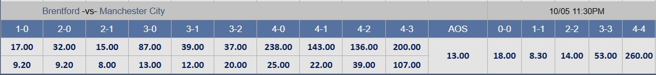 Tỉ lệ ban đầu Manchester City chấp chỉ nừa một, lún tiền (ăn 82, thua đủ). Nhưng đến sáng thứ Bảy, tỉ lệ đã chuyển thành chấp hẳn 1 trái và Brentford chỉ ăn 82. Đến trưa nay, thị trường lại biến động khi chuyển trở lại là Manchester City chấp nửa một, ăn 8 thua đủ. Tuy nhiên, tỉ lệ (chấp nửa một, ăn 8) này rất gần với 1 trái và thị trường có thể biến động trước giờ bóng lăn. Dù sao thì với quyết tâm của Manchester City, chọn cửa trên vẫn vui hơn.