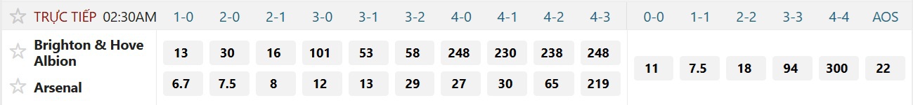 Tỉ số được ưa chuộng nhất là Arsenal thắng 0-1 với mệnh giá đặt 1 ăn chỉ 6.7, trong lúc thắng 0-2 ăn 7.5, còn thắng 1-2 ăn tới 8. Tỉ số gây nhiều chú ý là hòa 1-1 với mệnh giá đặt 1 ăn 7.5, còn 0-0 ăn 11. Cửa thắng của Brighton cũng được đánh giá không nhỏ khi 1-0 có giá đặt 1 ăn 13, còn 2-1 ăn 16.