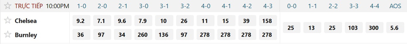 Tỉ số được ưa chuộng nhất là 2-0 với mệnh giá đặt 1 ăn chỉ 7.1. trong lúc 3-0 ăn 7.9, 3-1 ăn đến 10. Còn 1-0 và 2-1 ăn lần lượt 9.2 và 9.6. Hòa không phải là đáp án khả thi của trận này khi 1-1 ăn đến 13, còn 2-2 ăn 25. Không ai tin Burnley thắng trận nên tỉ số gây sốc 1-0 và 2-1 đều có giá khủng: đặt 1 ăn đến 36 và 34.