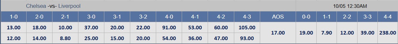 Tỉ số phổ biến nhất là 1-1 khi mang mệnh giá đặt 1 ăn chỉ 7.9. Đứng ngay sau đó là tỉ số thắng sít sao của Liverpool với 1-2 có giá đặt 1 ăn chỉ 8.8, trong lúc cửa thắng 2-1 của Chelsea có giá đến 10.Một kết quả đáng lưu ý là kết quả hòa 2-2 có mệnh giá đặt 1 ăn 12. Tỉ số thắng sít sao 0-1 của Liverpool cũng có mệnh giá tương tự, còn 0-2 có giá đặt 1 ăn 14. Ngược lại, tỉ số thắng 1-0 của Chelsea cũng mang mệnh giá nhiều triển vọng khi đặt 1 ăn 13.