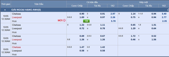 Tỉ lệ khởi điểm của trận đấu rất sít sao: Nhà vô địch Liverpool chấp chỉ đồng nửa và chủ nhà Chelsea lún tiền (ăn chỉ 85). Sự hợp lý của tỉ lệ khiến thị trường lắng đọng và người ta tin rằng việc chọn bên chỉ là vấn đề cảm tính. Dù sao, Liverpool vẫn trội hơn chút ít với đội hình đồng nhất, còn Chelsea có thể phải trả giá cho sứt mẻ lực lượng, nhất là khi vắng Cole Palmer. Chọn cửa trên hợp lý hơn.