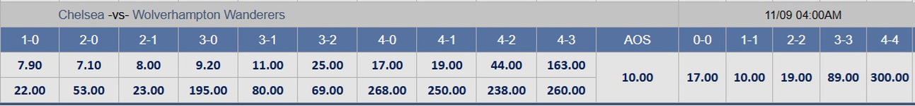 Chỉ những ai bạo gan mới chọn tỉ số hòa 1-1 với mệnh giá đặt 1 ăn đến 10. Đa số đều dồn vào cửa thắng cho Chelsea với tỉ số phổ biến nhất là 2-0 có mệnh giá đặt 1 ăn chỉ 7.10, 1-0 ăn được 7.9, 2-1 thì ăn 8, còn 3-0 ăn đến 9.2.