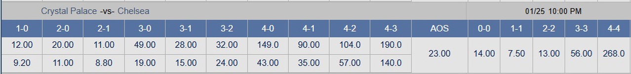 Vì 2 đội đã hòa nhau 3 trận gần nhất, nên không ai ngạc nhiên khi tỉ số được chọn nhiều nhất là 1-1 với mệnh giá đặt 1 ăn 7.50. Các tỉ số thu hút nhiều nhất vẫn là cửa thắng của Chelsea. Với tỉ số 1-2 có giá dặt 1 ăn 8.8, 0-1 ăn 9.2, 0-2 ăn 11. Trong lúc cửa thắng của Palace cũng gây chú ý như 2-1 ăn 11 hay 1-0 ăn 12.
